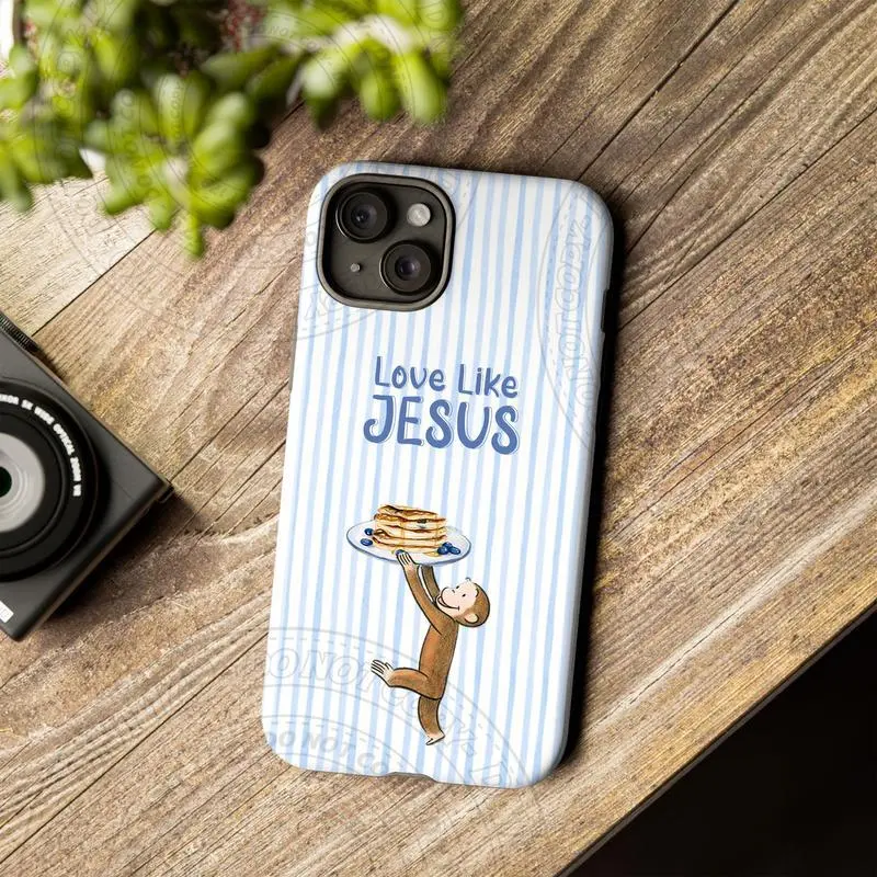 Curious George IPhone Case, Cartoon Monkey Phone Cover with Love Like Jesus Bible Verse and Pancake Design Phone Case Suitable for IPhone 17, 16, 15, 14, 13, 12, 11 Pro Max, X, XR, XS Max, 8, and 7 Plus