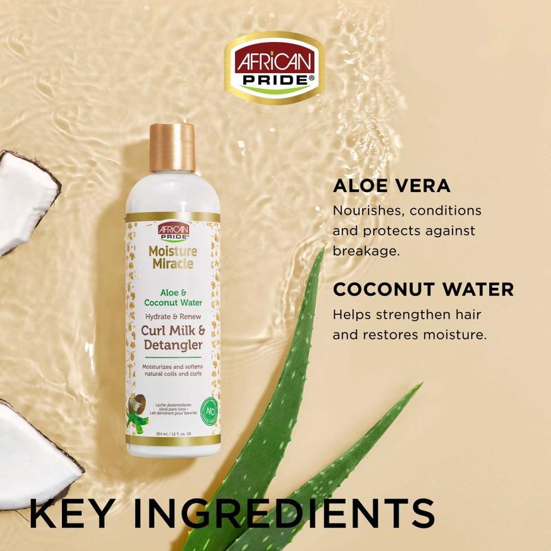 AFRICAN PRIDE MOISTURE MIRACLE ALOE & COCONUT WATER CURL MILK & DETANGLER, 12FL OZ