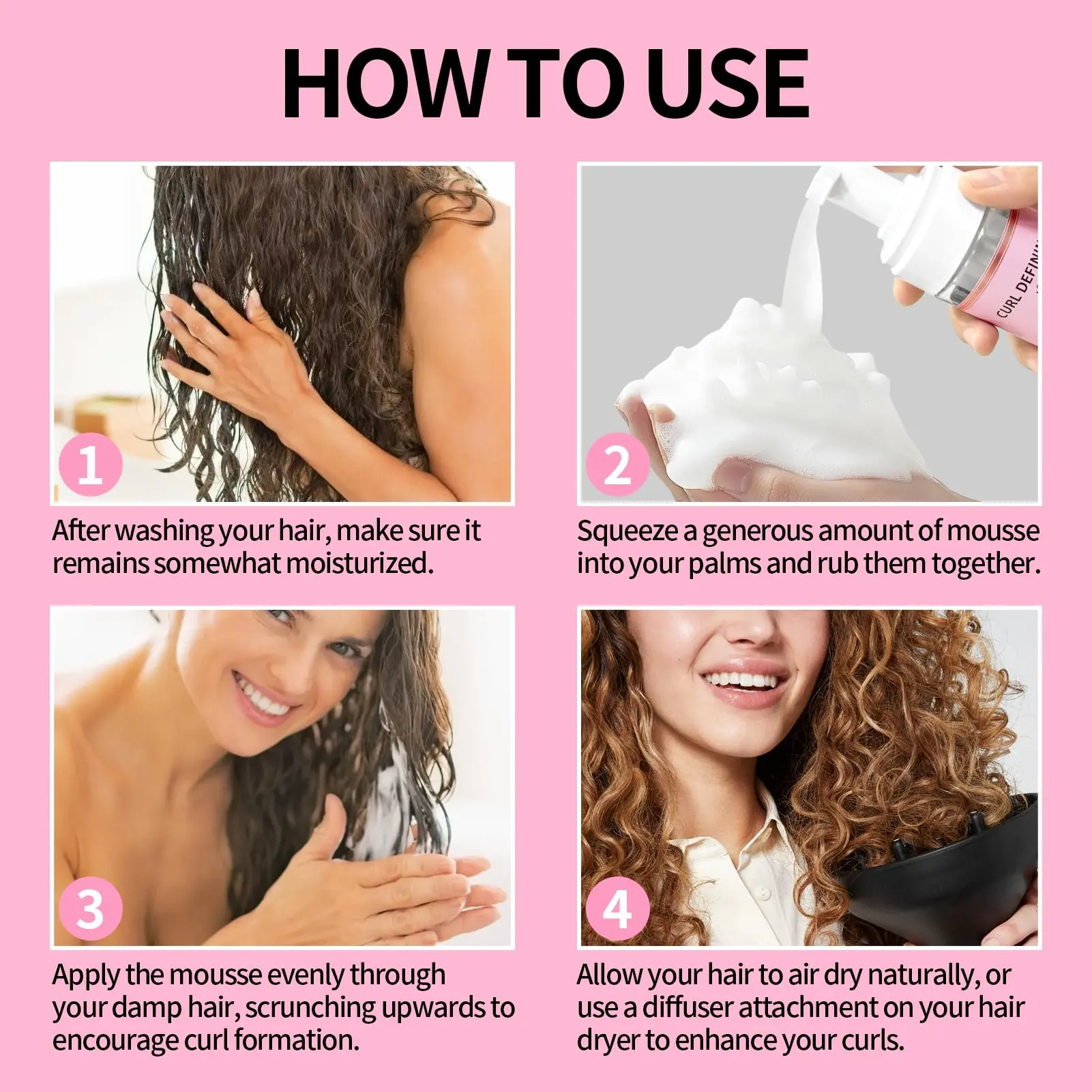 ·Transform Your Curls: Experience the ultimate care for your curly hair with our curl mousse, designed to define, brighten, and tame frizz for a stunning, natural look