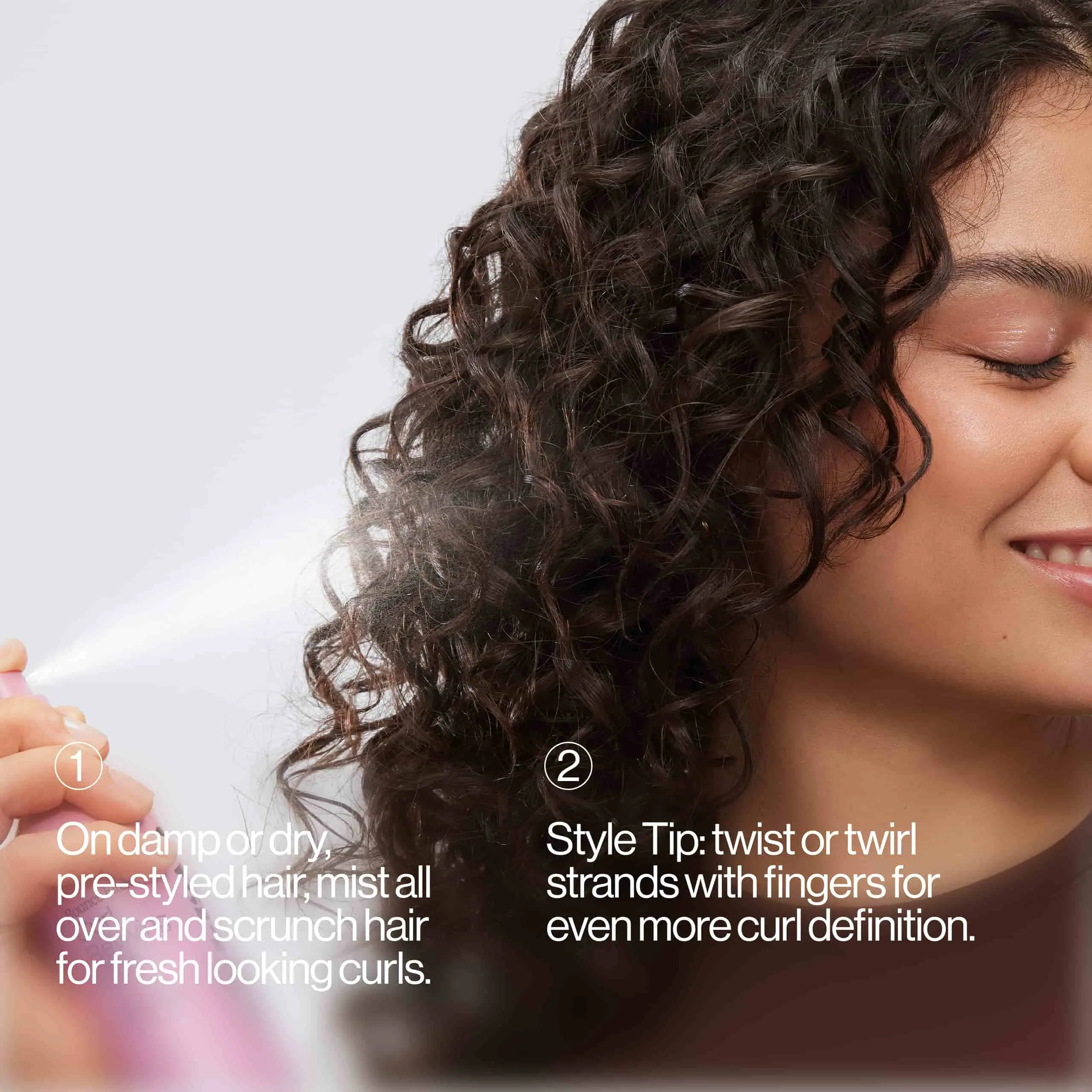 Β·On damp or dry, pre-styled hair, mist all over and scrunch hair for fresh looking curlsΒ
