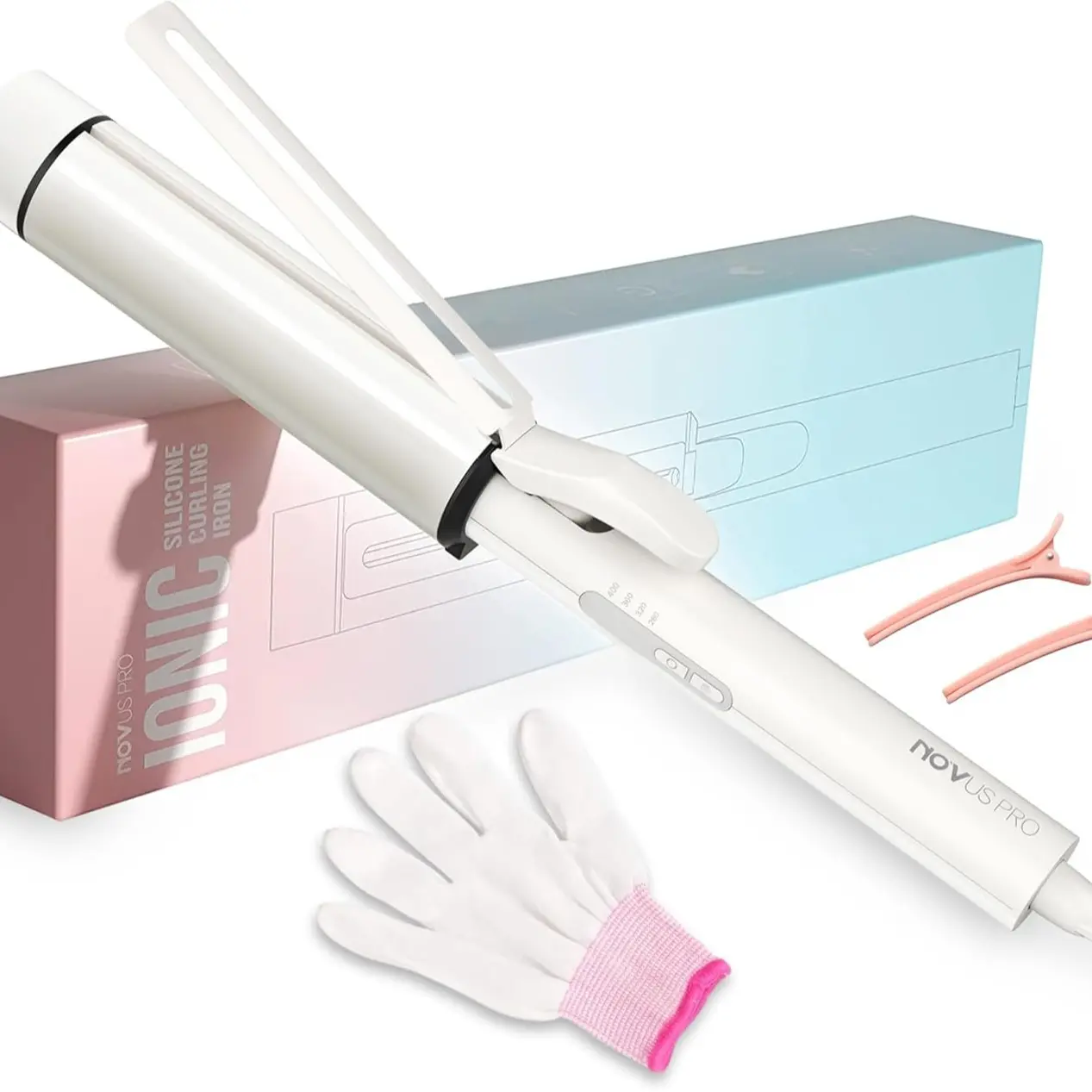 Full list of items included in the package: 1 Curling Iron, 1 glove, 1 manual and 2 Clips