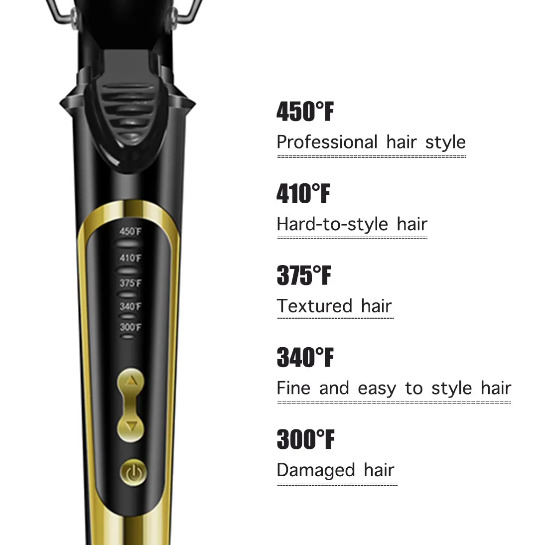 ·[5 Heat Setting for Different Hair Types] - Adjustable Temperature 300°F - 450°F make it easy to select the right temperature for your hair. The temperature lock function allows you to lock the styler at your preferred temperature during styling.