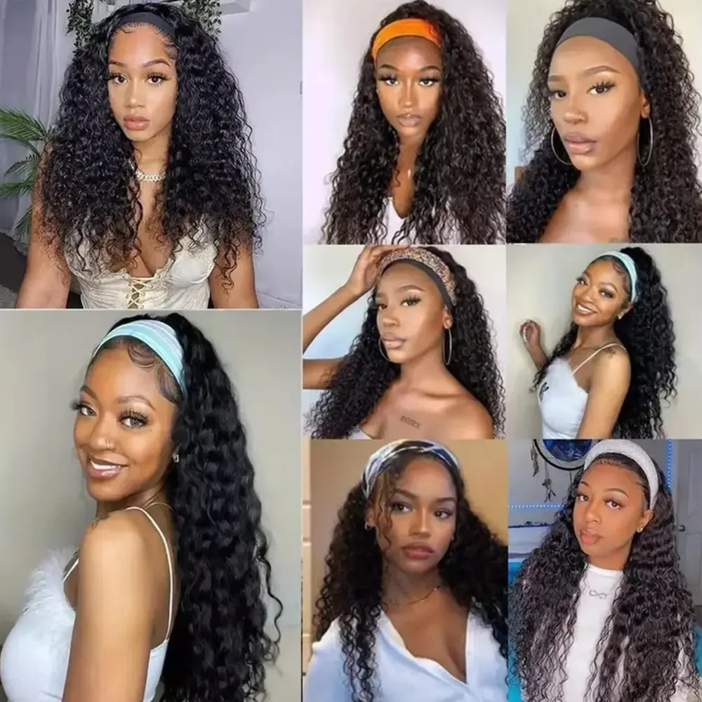 Deep Wave Headband Wig Human Hair 180% Density Wigs For Women 100% Real Hair Wigs Full Machine Made Wigs Natural Black Hair