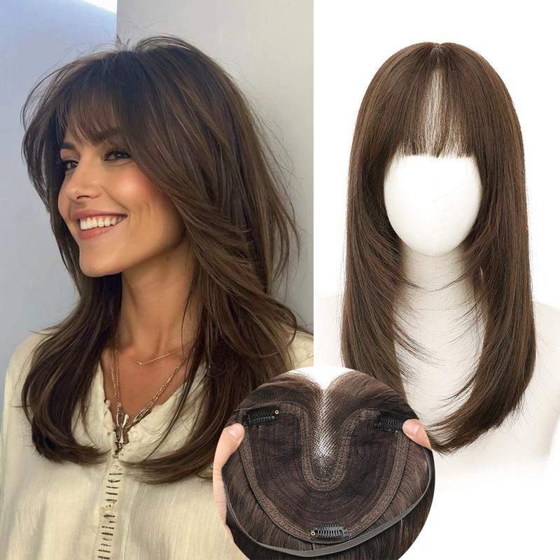 ·【Create Your New Hairstyle】This 18-inch dark brown premium synthetic hair topper instantly conceals thinning hair and wide part lines. With effortless clip-on application, achieve naturally sleek straight locks with 2X fuller volume and wispy bangs—realizing your goddess-length hair dreams in seconds.