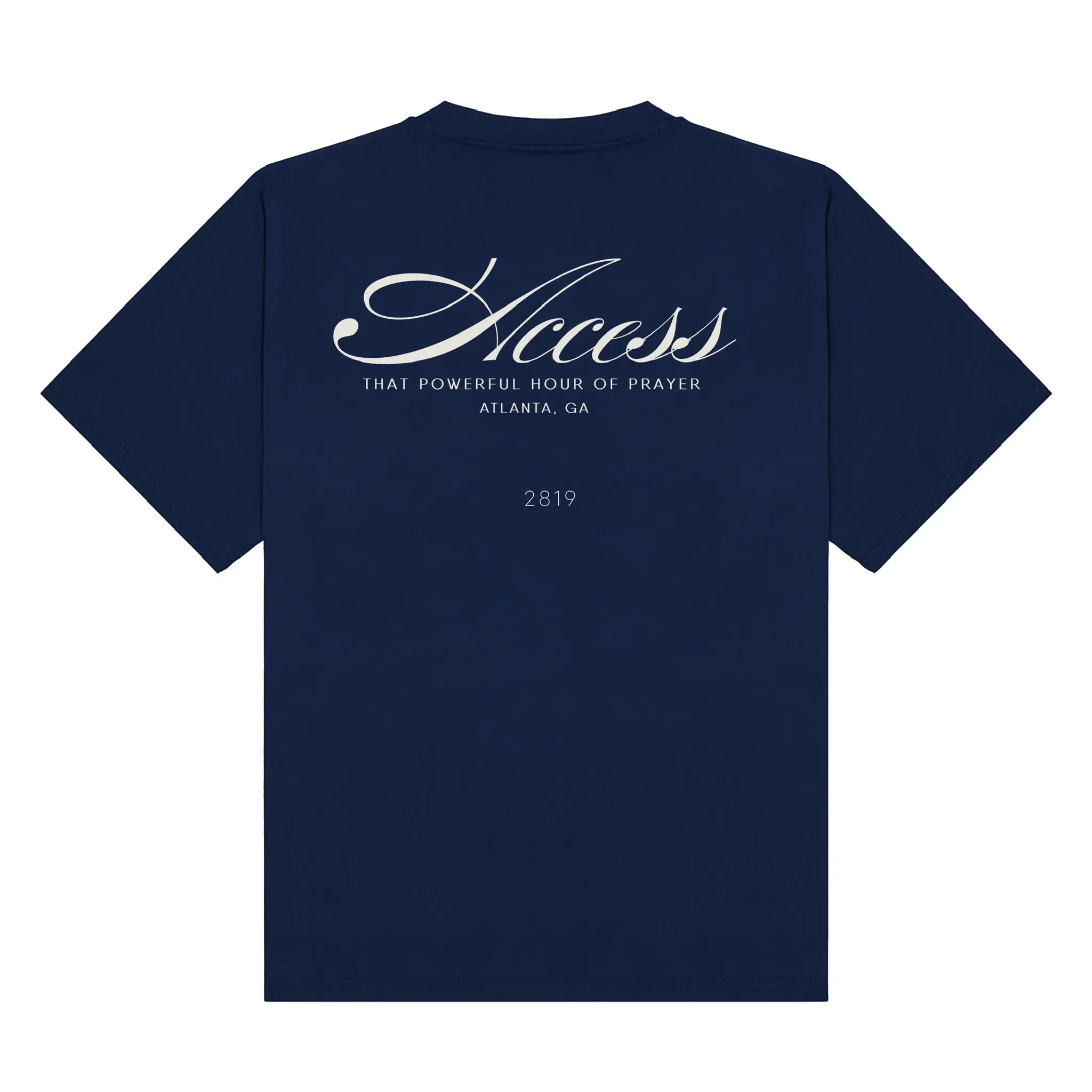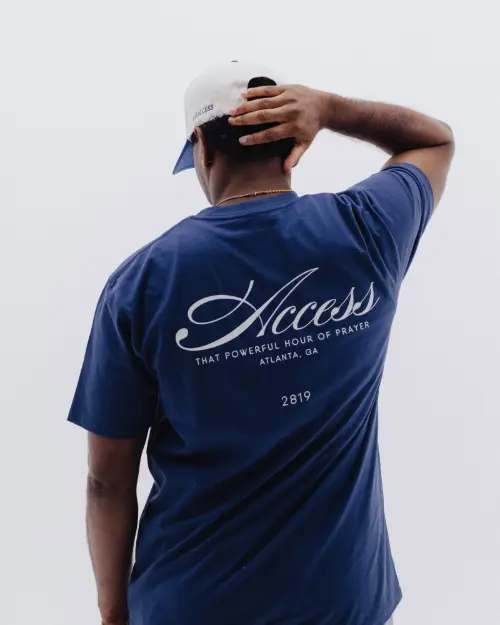 A clean, elevated statement piece—“Access” script on the back with “That Powerful Hour of Prayer” Minimal front, mission on display.