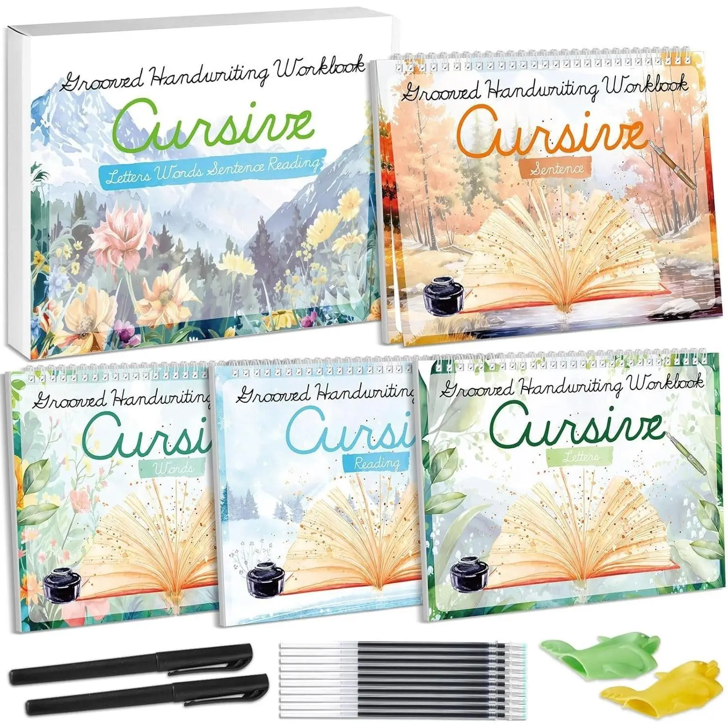 Cursive Writing Practice Kits: feature grooved cursive handwriting workbooks covering letters, words, sentences, and reading, 4 books in total, 2 disappearing ink pens, 2 pencil comfort grips, 10 refills—ideal for teens, , and adults refining cursive skills. Versatile beginner to tool.