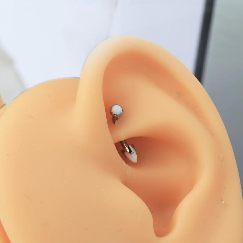 This titanium curved opal rook earring is a luxurious accessory featuring stunning opal gems on both sides. Internally threaded for improved wear, durability, and safety, it's a sophisticated and elegant piece of jewelry perfect for daily life.