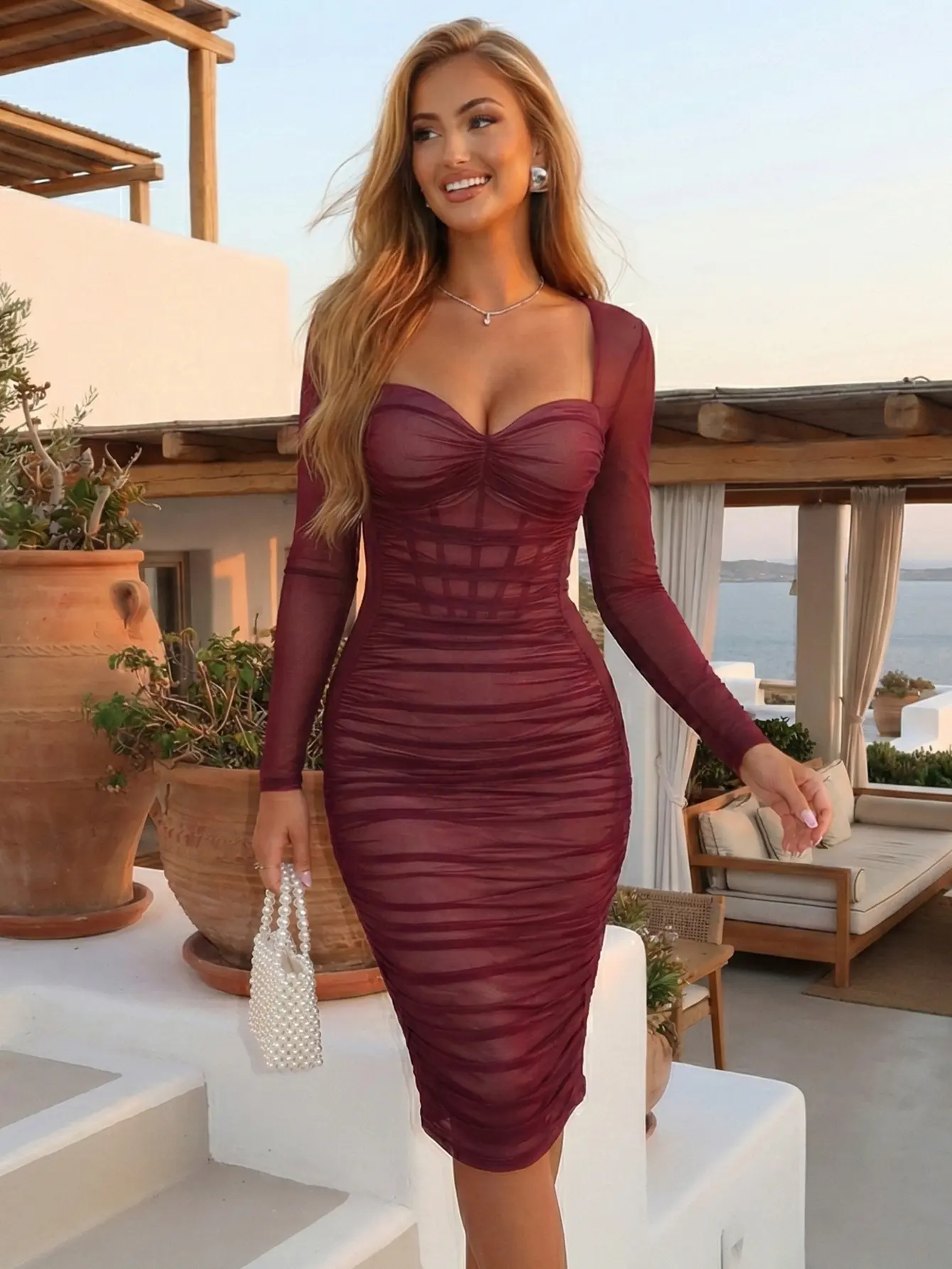 This dress is an eye-catching ruched mesh bodycon dress, perfect for Christmas and holiday parties.This built-in bra dress with long sleeves and backless features a sweetheart neckline, perfect for cocktail parties, wedding guests attire, formal dinners, and other formal occasions, showcasing a stylish and elegant look.