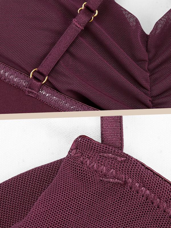 โข Ruched mesh detailing enhances curves and slims the silhouette