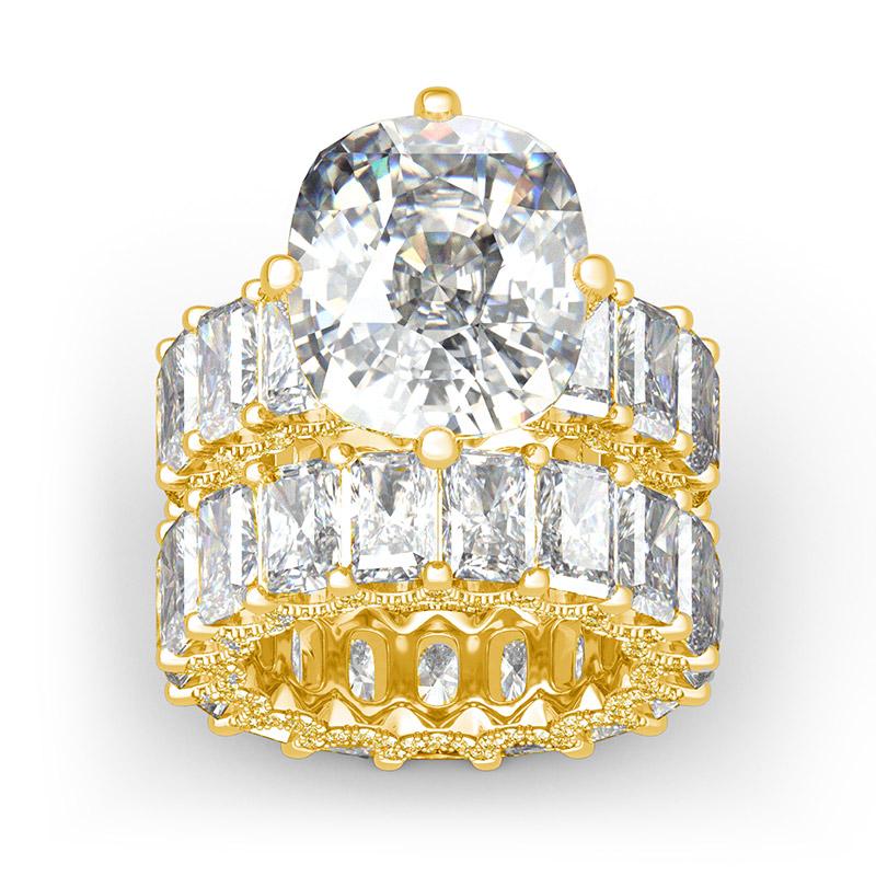 Crafted with care in every detail, this sparkling ring set displays an impressive level of artistry. A cushion cut stone shines brightly at the center, while additional stones adorn the ring's shank in three sides, creating a truely dazzling look from any angle. On your special day, a coordinating eternity band completes this fabulous ensemble. This stunning style offers incomparable beauty and unmatched quality.