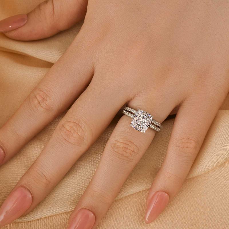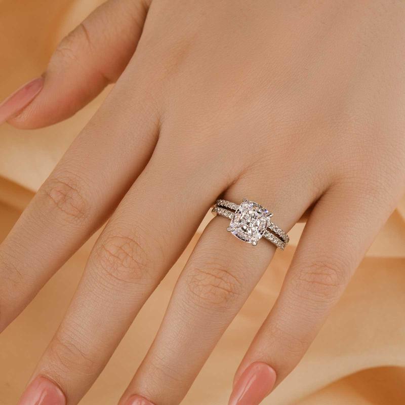 Indulge in the timeless beauty of a 3.0 carat cushion cut wedding set that radiates elegance and sophistication. This stunning set is designed to capture attention and symbolize everlasting love.