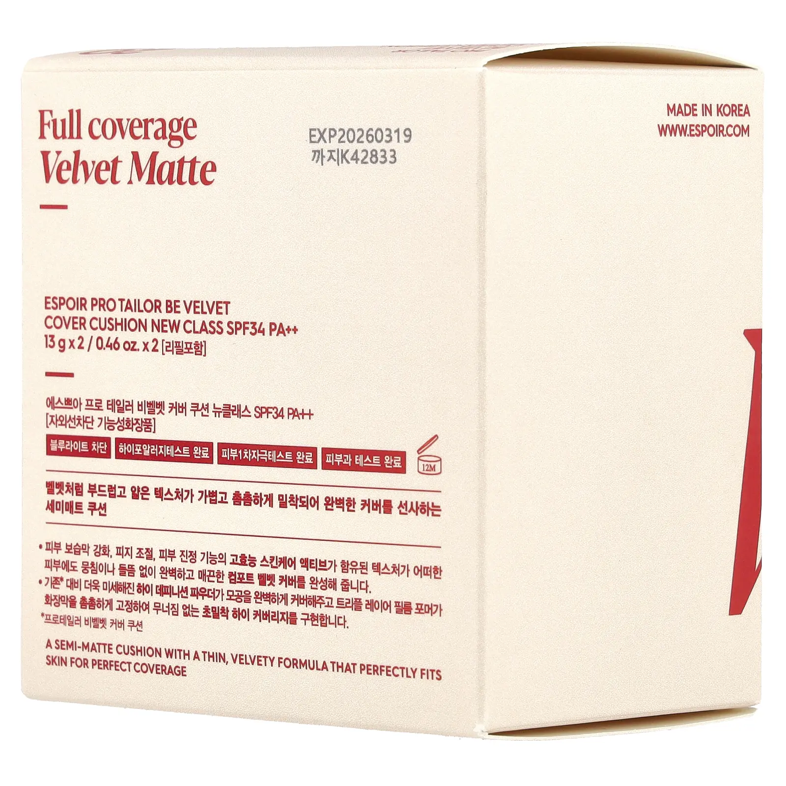 Espoir Pro Tailor Be Velvet Cover Cushion New Class, SPF 34 PA++, 20 Vanilla, 2 Count, 0.46 oz (13 g) Each
