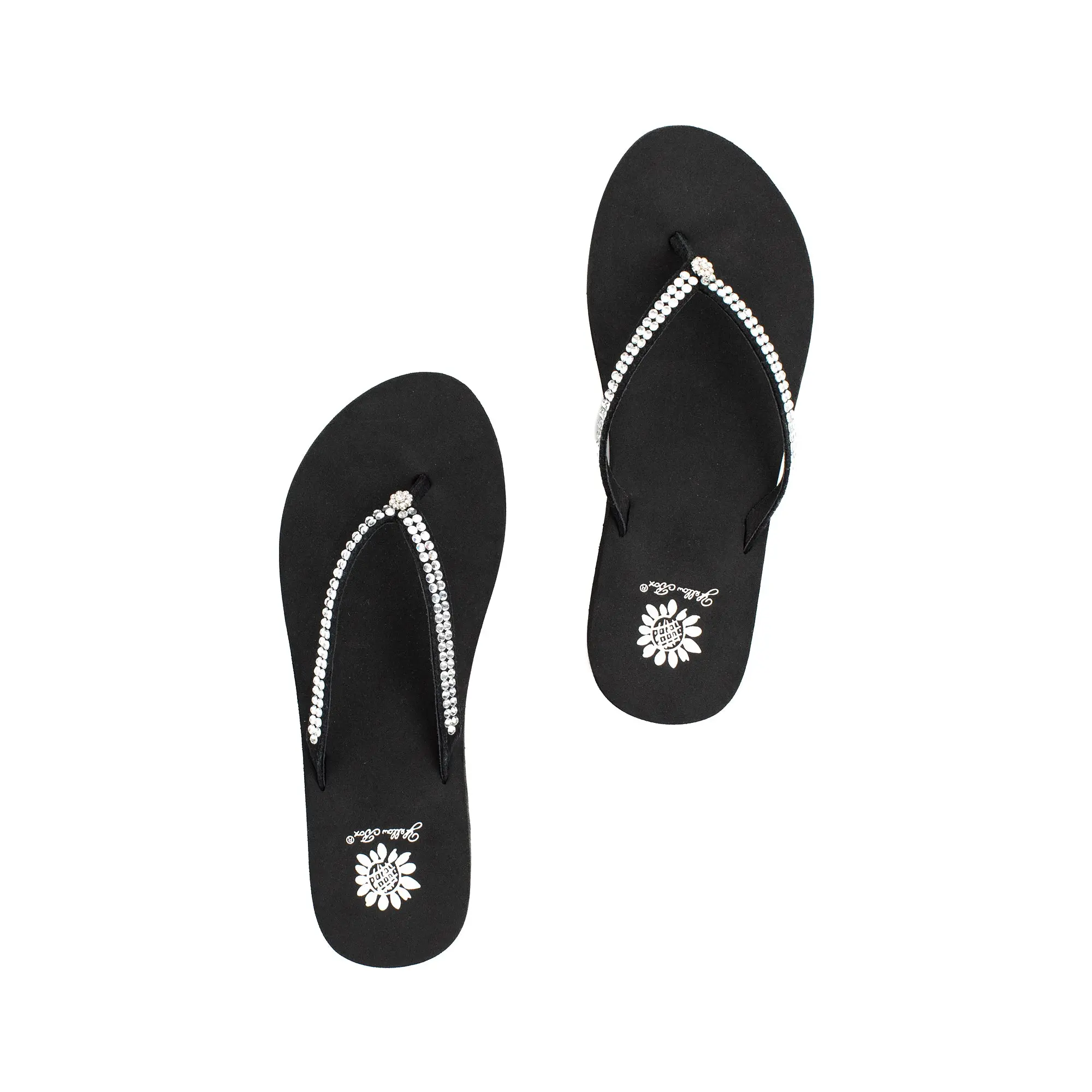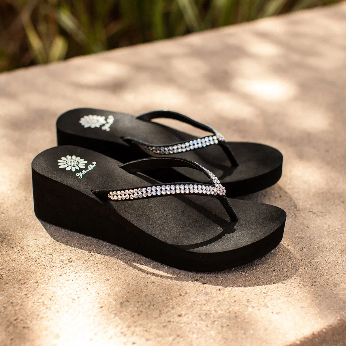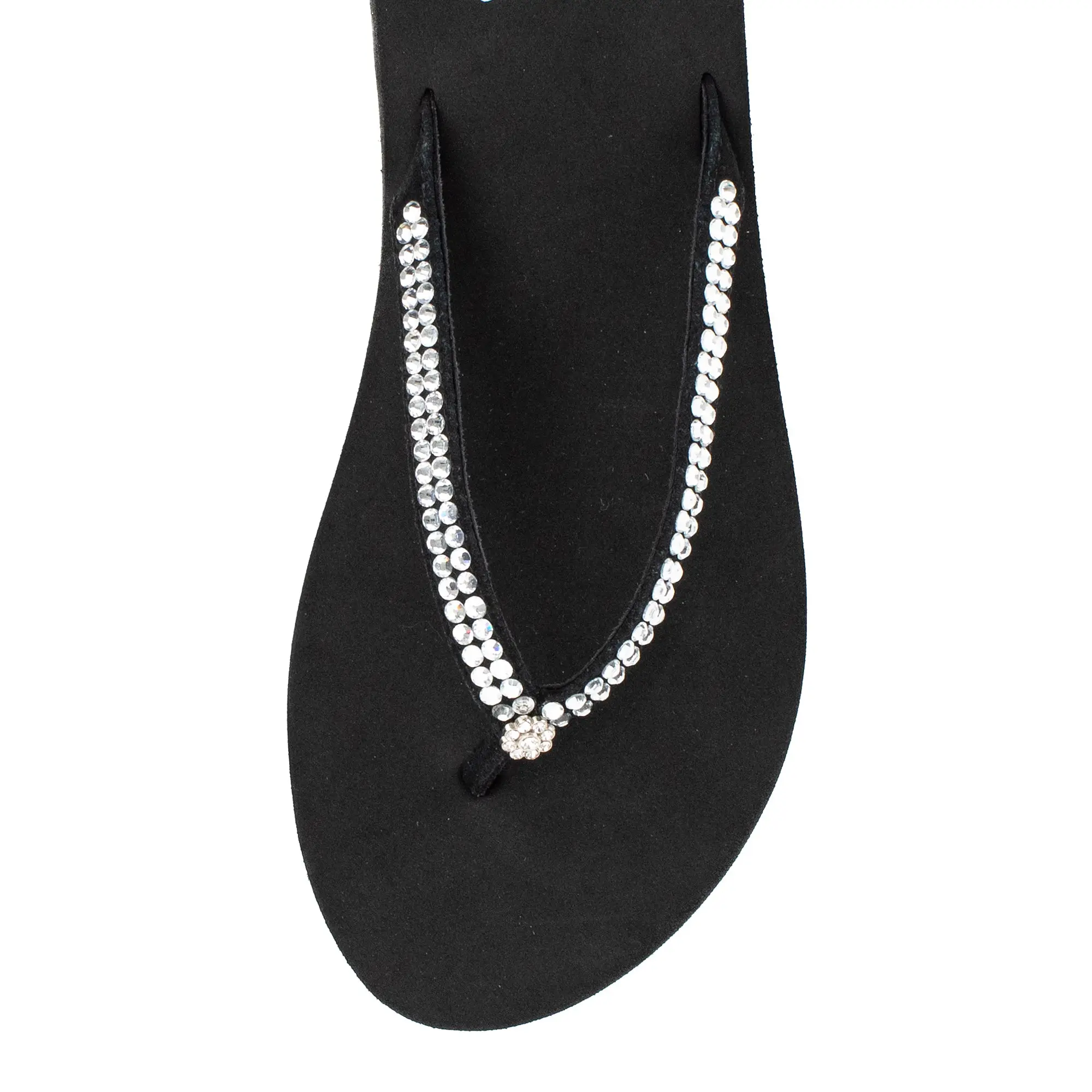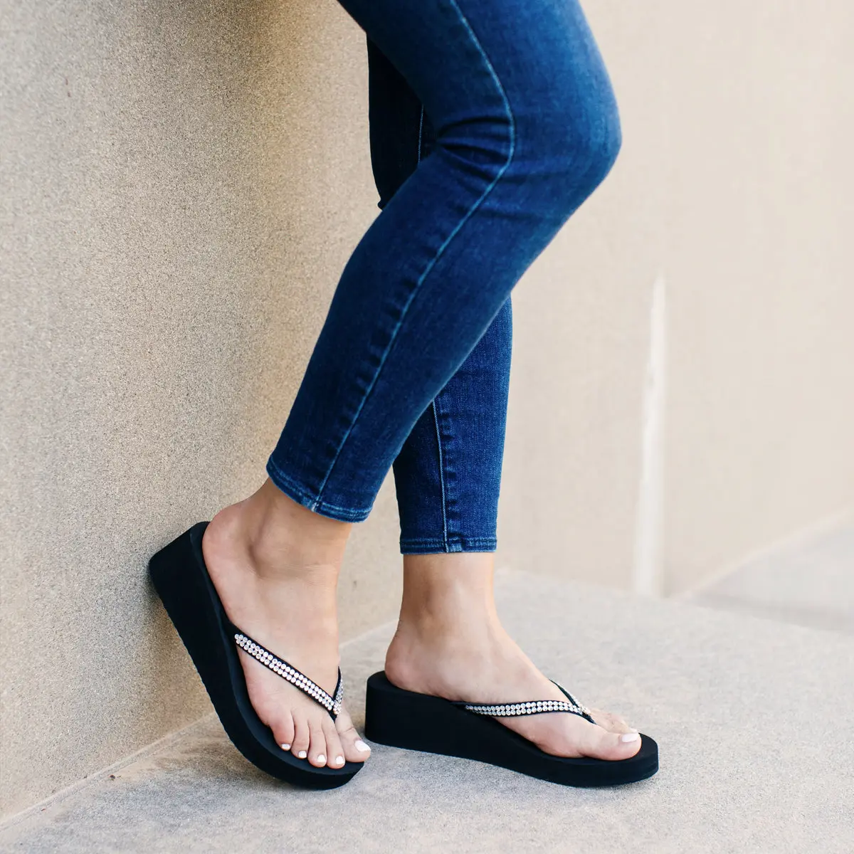 Charming and shining rhinestone-decorated straps top a sleek, modern wedged EVA foam sole to make the simplest.