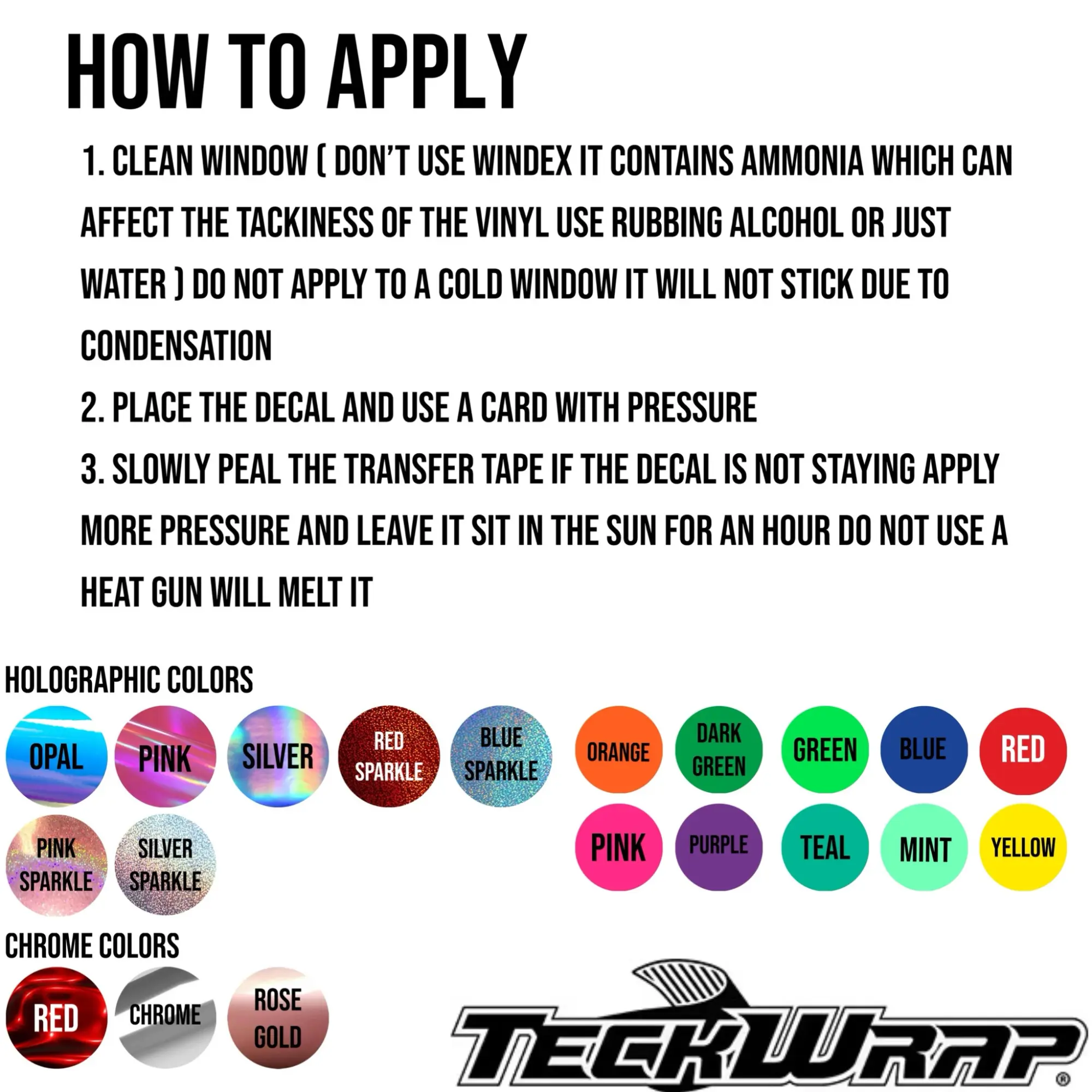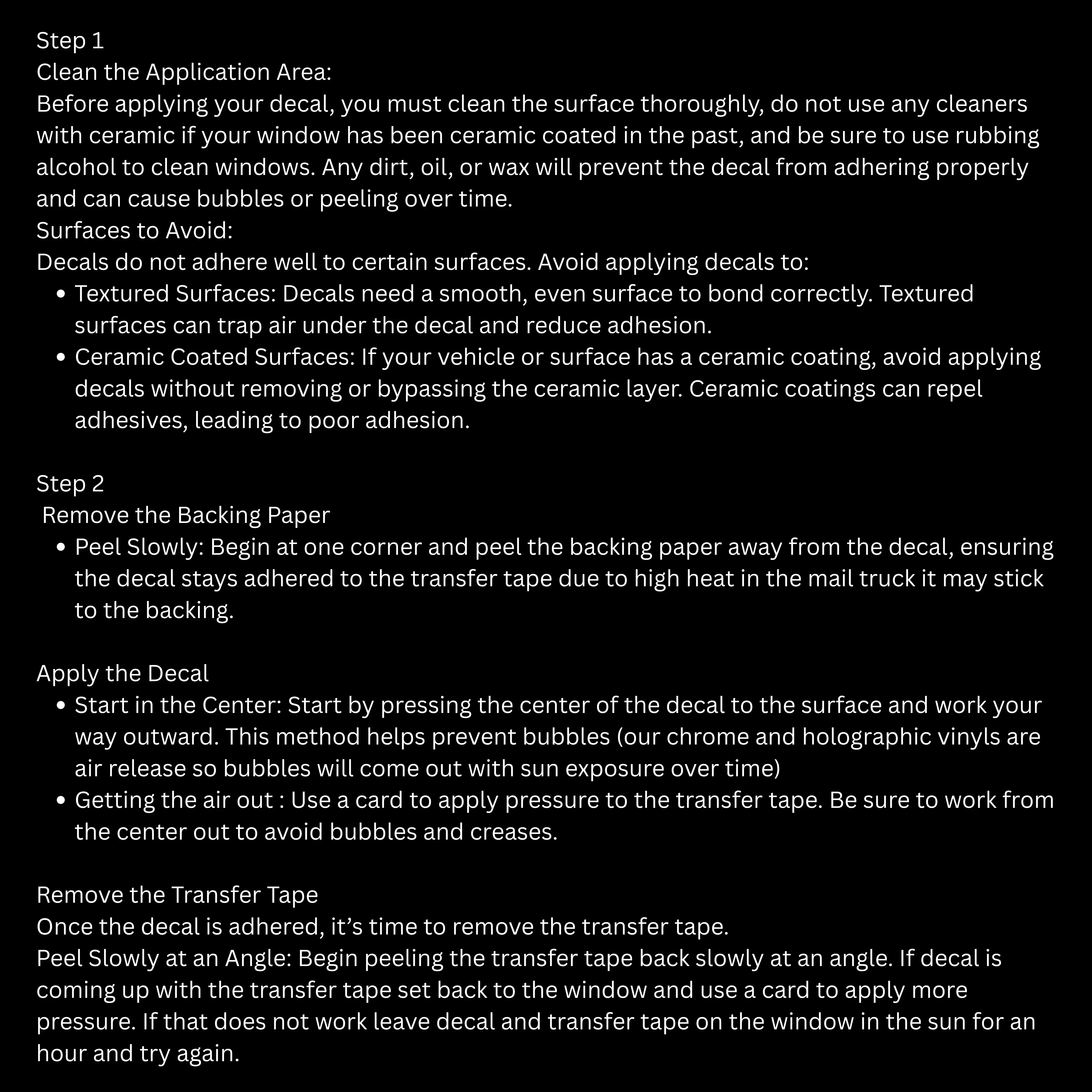 Wrong shipping address? Contact us ASAP. Returns due to incorrect addresses or insufficient details cannot be refunded or replaced. Damaged decal? Take pictures before separating the transfer tape and contact us. Installation mistake? Send us pictures for a potential discount on a replacement.