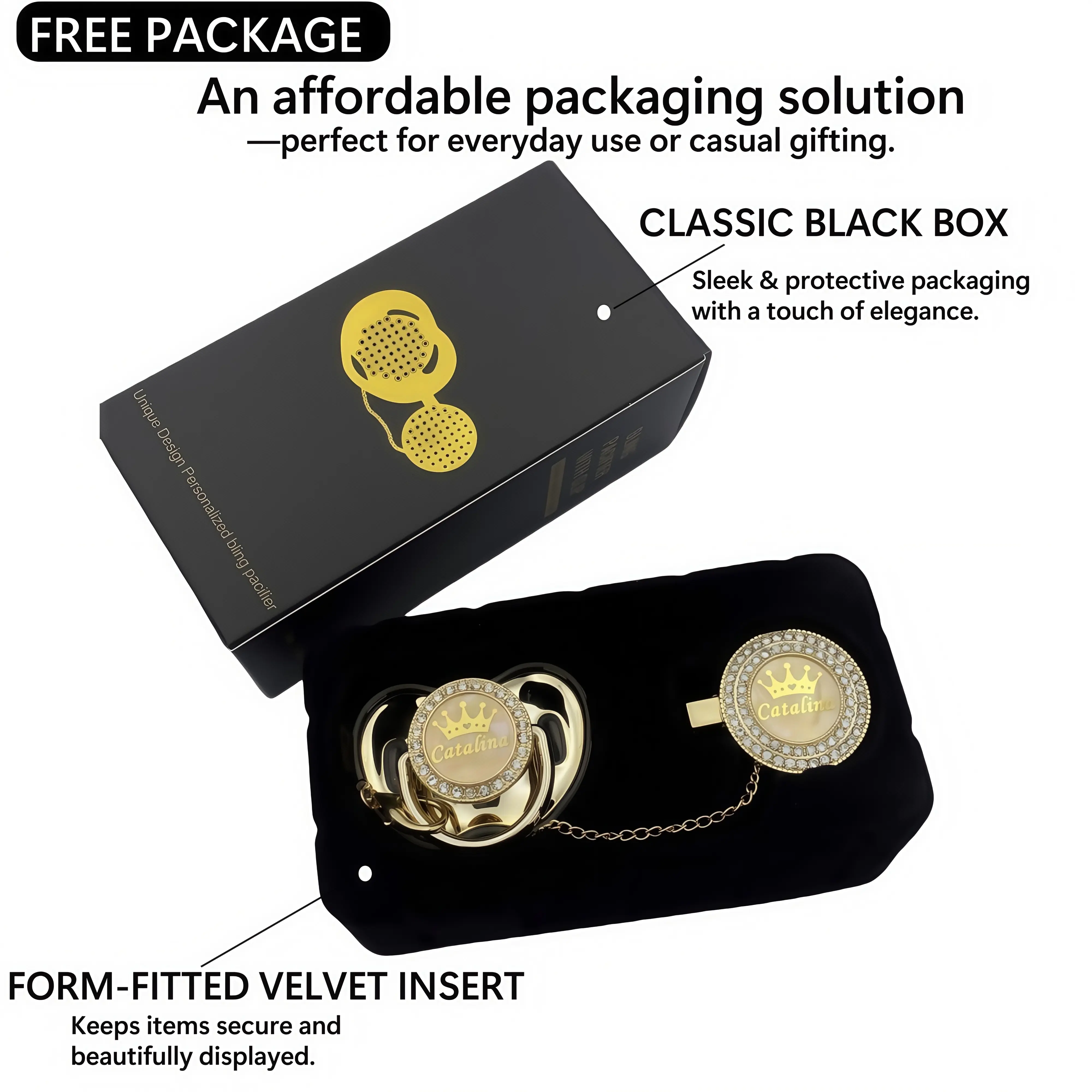 Treat your baby like royalty with this custom bling pacifier gift set, featuring a sparkling pacifier, matching clip, and elegant storage case — all personalized with your baby’s name 👶✨