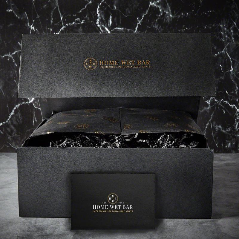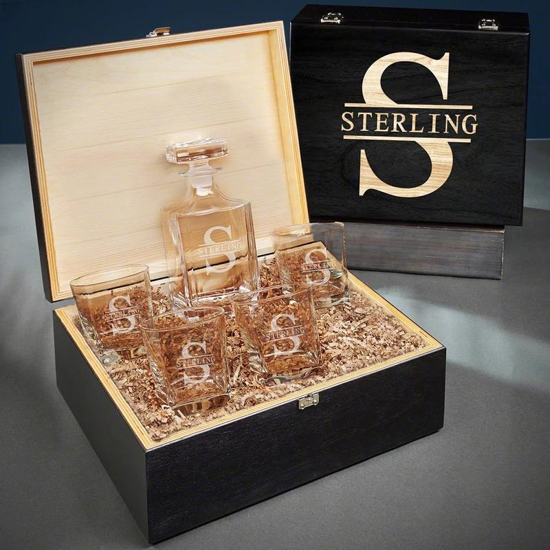 Your bourbon will be better than ever with this stunning custom bourbon decanter set! Included is a spectacular crystal decanter, four square-shaped rocks glasses, and a handsome black gift box. The entire set is personalized with an initial and name of your choosing. The beautiful decanter will highlight the golden hues in your favorite bourbon, making it look and taste better than ever before. The unique glasses fit snugly in the hand and are the perfect size for a double bourbon or a lowball cocktail. You can store the entire set in the gift box in between uses or use it to keep your prized bottles of bourbon secure! This incredible bourbon decanter set is a fantastic anniversary or Christmas gift for your husband or dad. Comes ready to gift with raffia paper filling inside. The gift box is made of black stained Baltic Birch wood in the USA and measures 13.25" x 11.75" x 5.5".