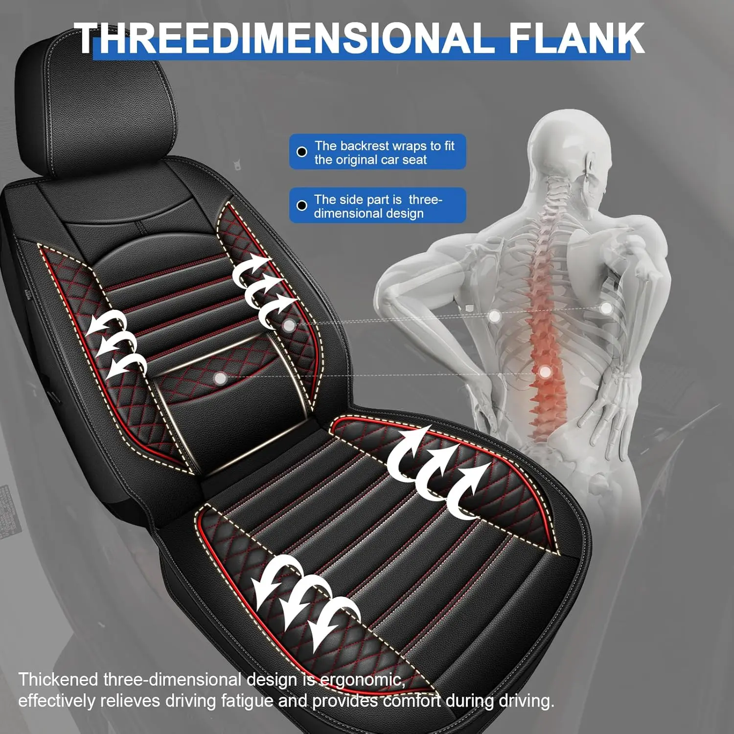 • 【Excellent Desgin】The seat covers with 3D lumbar support and side wing design, ergonomic, double the comfort, effectively relieve driving fatigue.