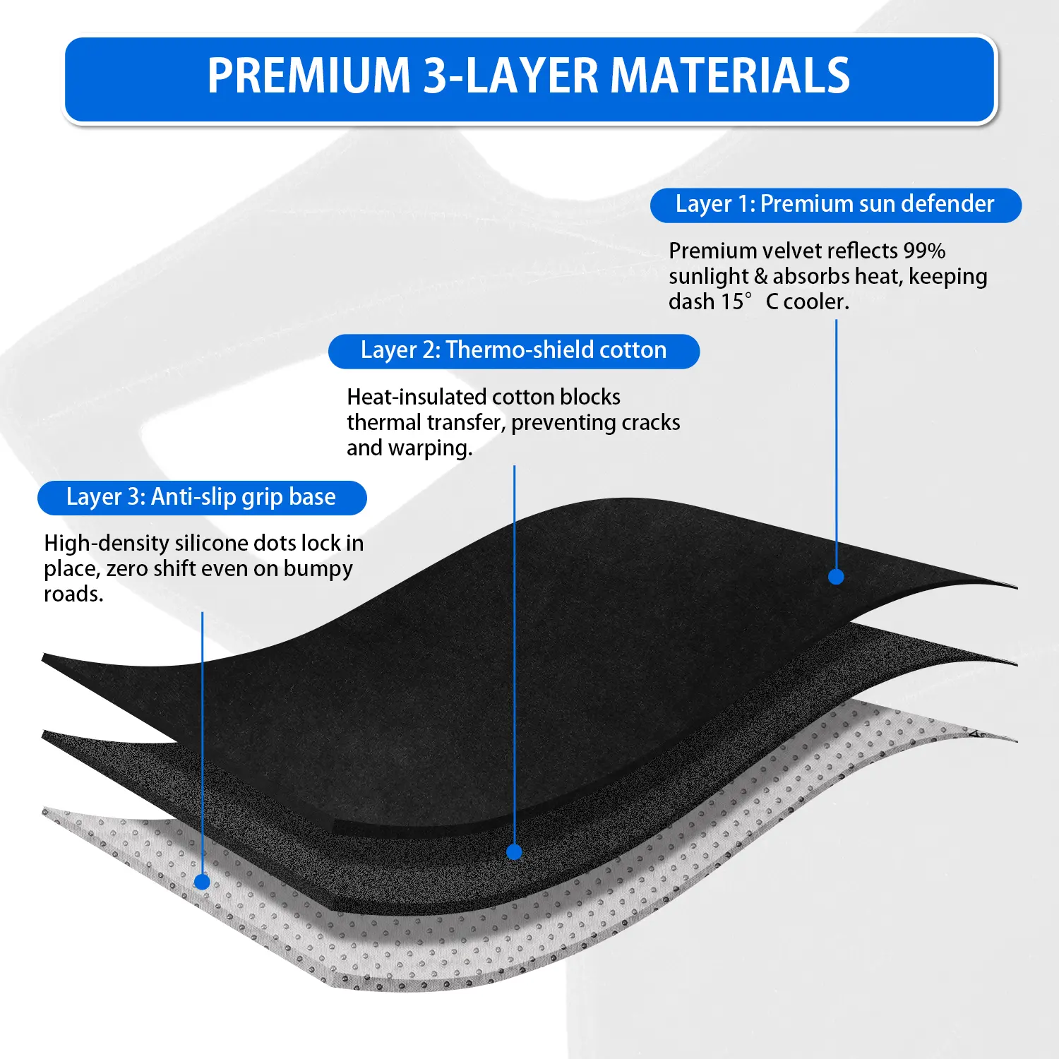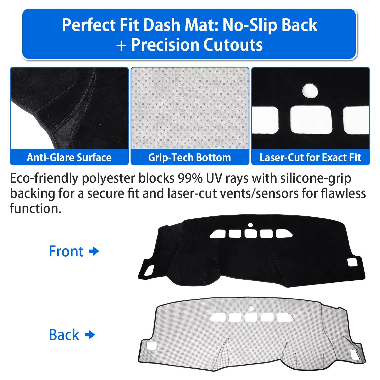 The dash mat provides essential UV protection, safeguarding your dashboard from harmful rays. Its design ensures that the sun's heat is effectively blocked, maintaining a comfortable interior temperature. This accessory is a practical choice for drivers looking to enhance their vehicle's interior protection without compromising on style or functionality.
