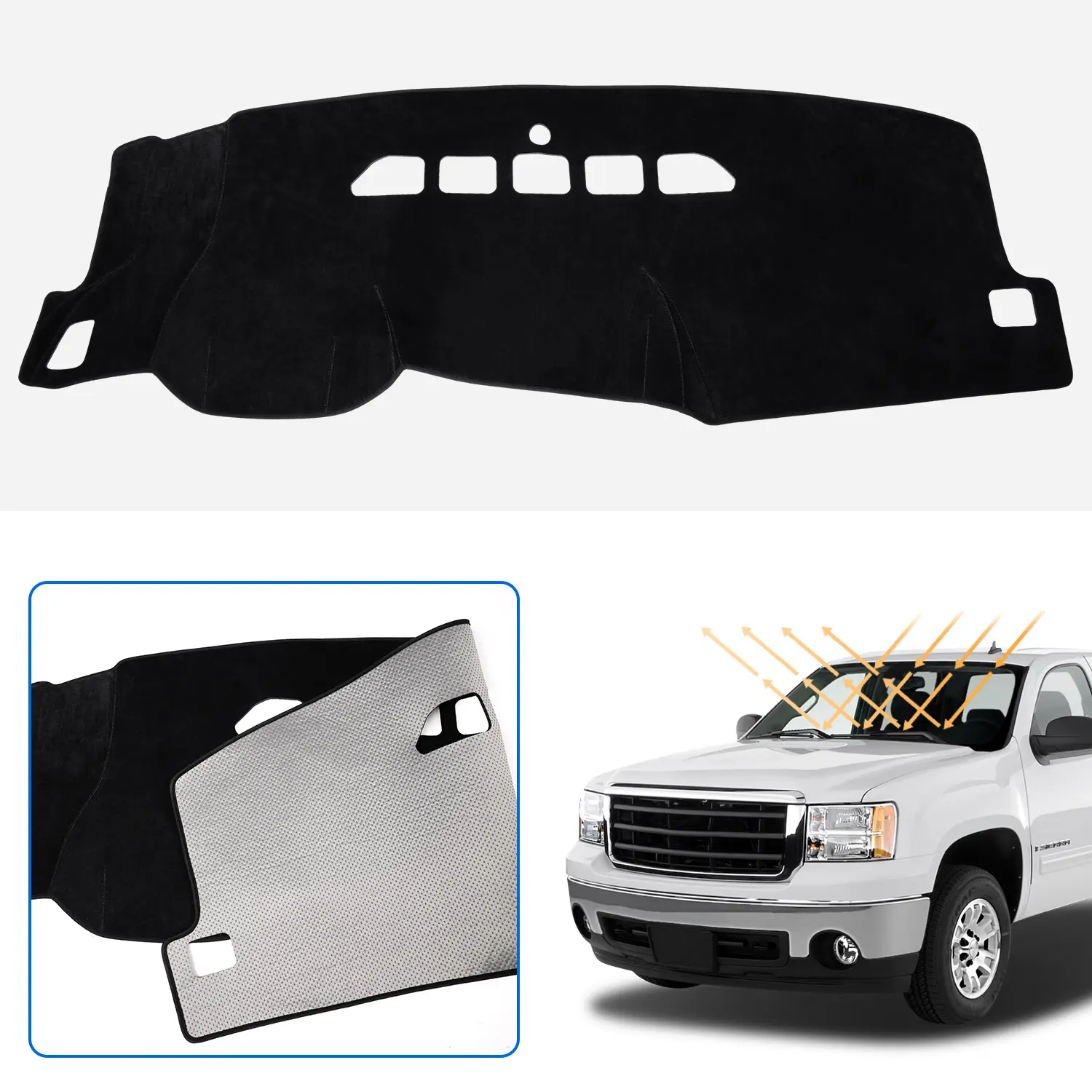 This flannel sunshade is designed for 2007-2013 Chevy Silverado and GMC Sierra models. It offers a custom fit, ensuring a snug cover over your vehicle's dashboard. The mat includes a non-slip surface for stability during driving. It also features glove box access, making it convenient for everyday use. Keep your dashboard clean and protected from the sun.