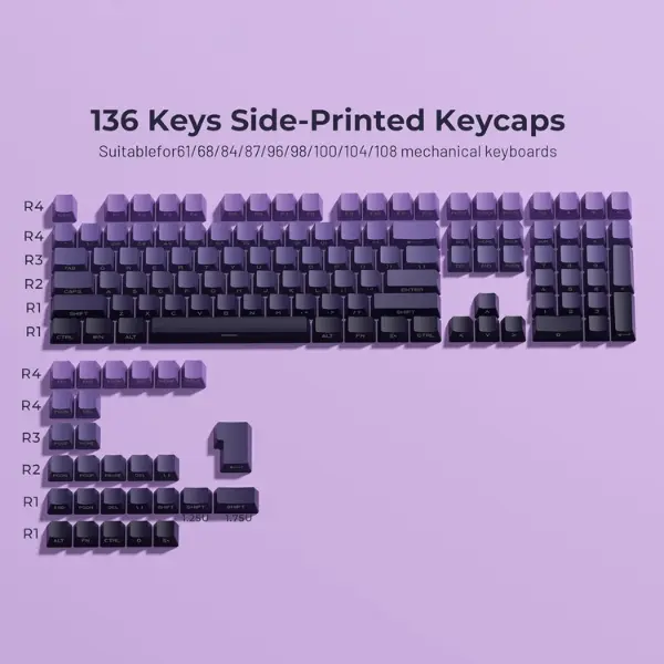 This keyboard keycap set consists of 136 keycaps, including 104 standard keys and 32 modifiers keys, compatible with most ASIN US and UK layout 61/64/68/84/87/96/98/100/104/108 mechanical keyboards.