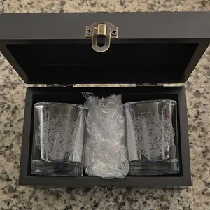 I’m very pleased with this purchase, looks exactly like it shows, The custom design with the name on the box is beautiful and delivered on time, I did not have to wait for a lengthy delivery. The classy glass wear etched beautifully on the two shot glasses inside the custom box.
