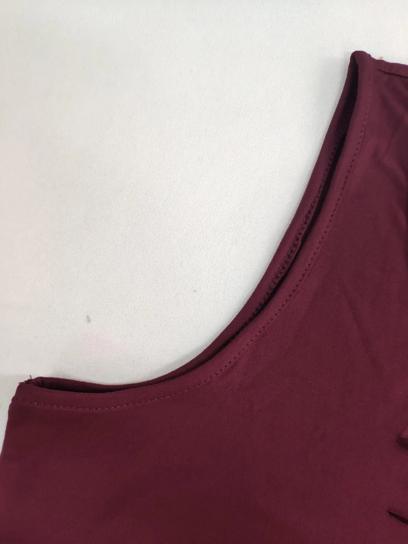 Very long with pleated/ruchetted bottom sides runs about a full size larger than expected.