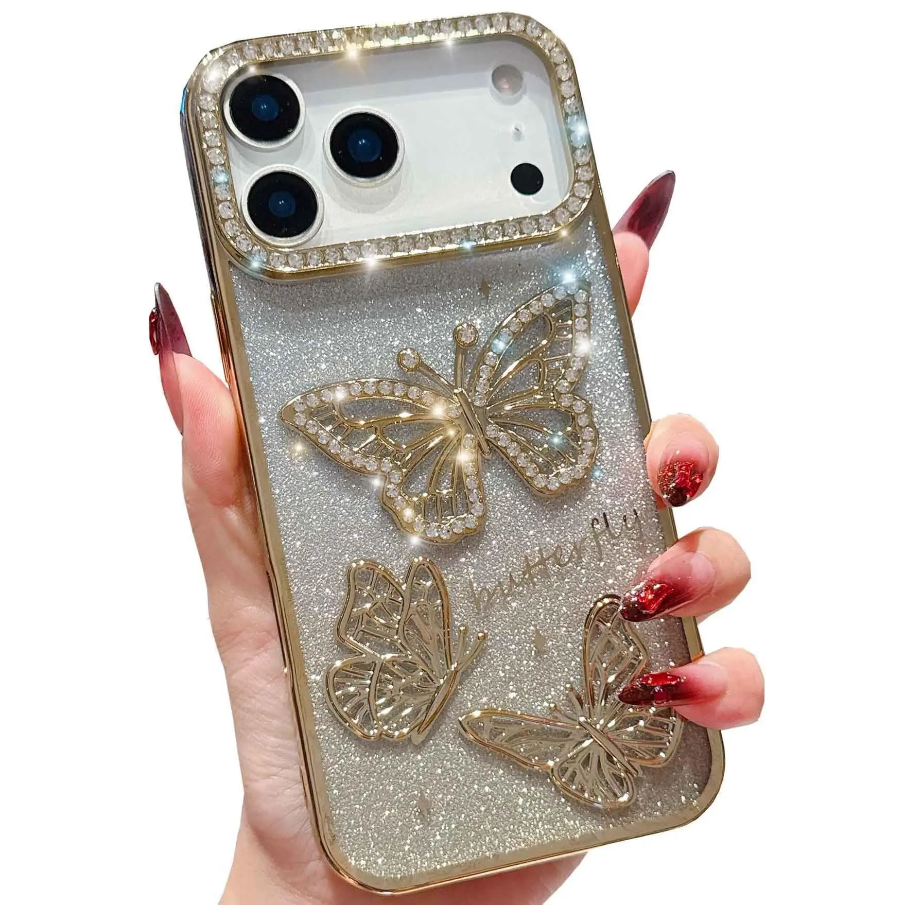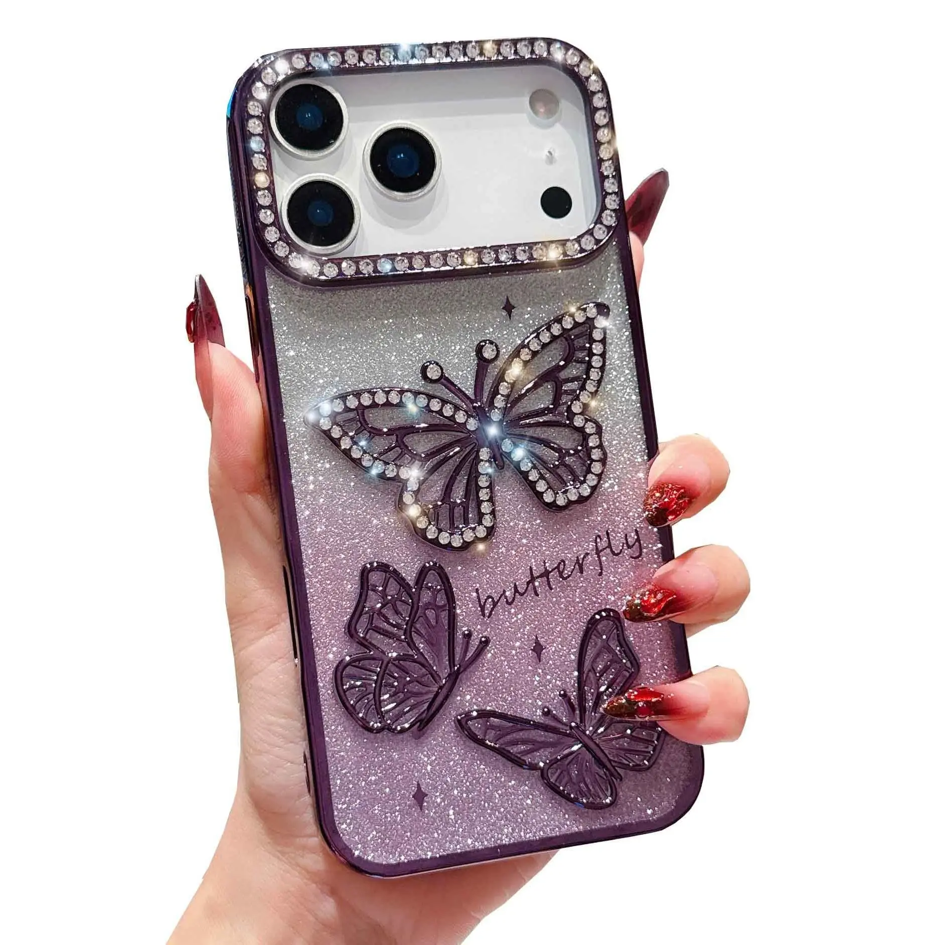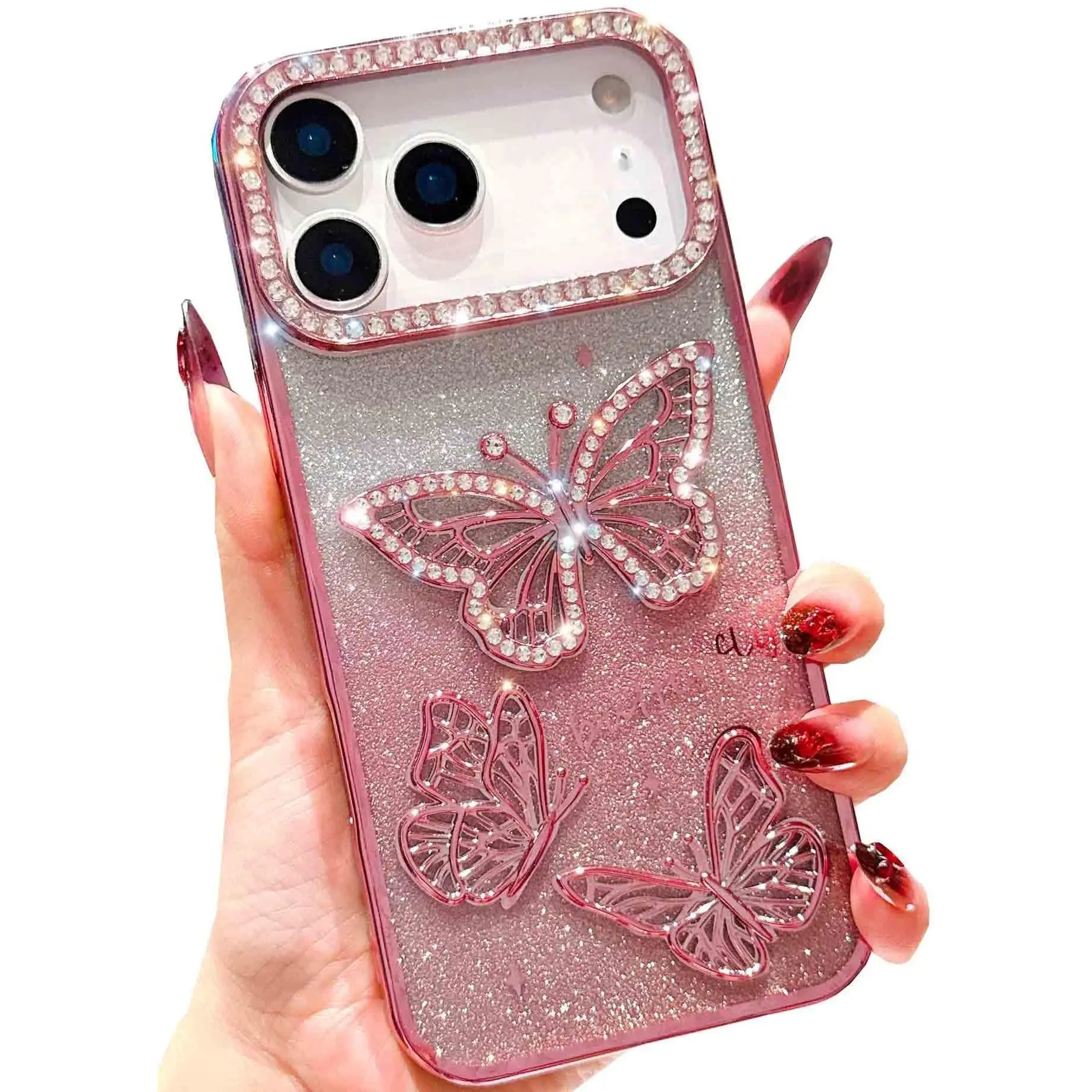 Cute 3D Butterfly Slim Plating Glitter Bling Luxury Cover for Women Girls Protective Camera Protection Bumper,