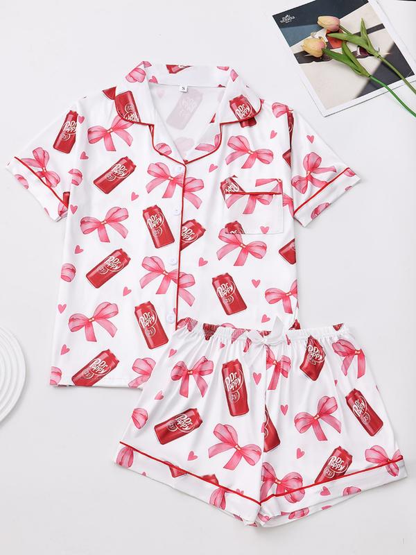 5. Valentine's Day Bowknot Heart Print Pajama Set, Soft Silk Striped Butterfly Knot Short Sleeve Sleepwear, Women's Comfortable Nightwear