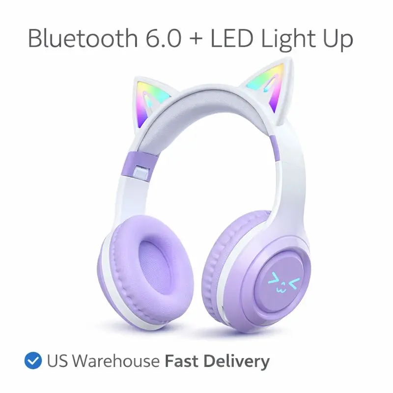 ·LED light up over ear headset LED light cat ear headphones that glow while you listen. The LED light up design makes them stand out in any room and looks amazing in videos, selfies, and live streams.