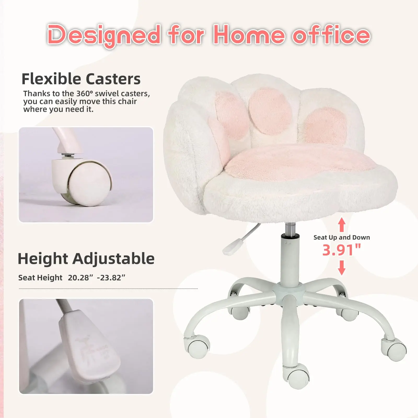 ·Smooth 360° Swivel & Effortless Height Adjustment: The base of this vanity chair is crafted from sturdy metal, equipped with 5 silent casters that enable smooth 360-degree movement, allowing you to glide effortlessly from your desk to your vanity area. The easy-lift gas cylinder allows quick seat height adjustment from 20.28" to 23.82", offering a custom fit for desks, vanities, or gaming setups.