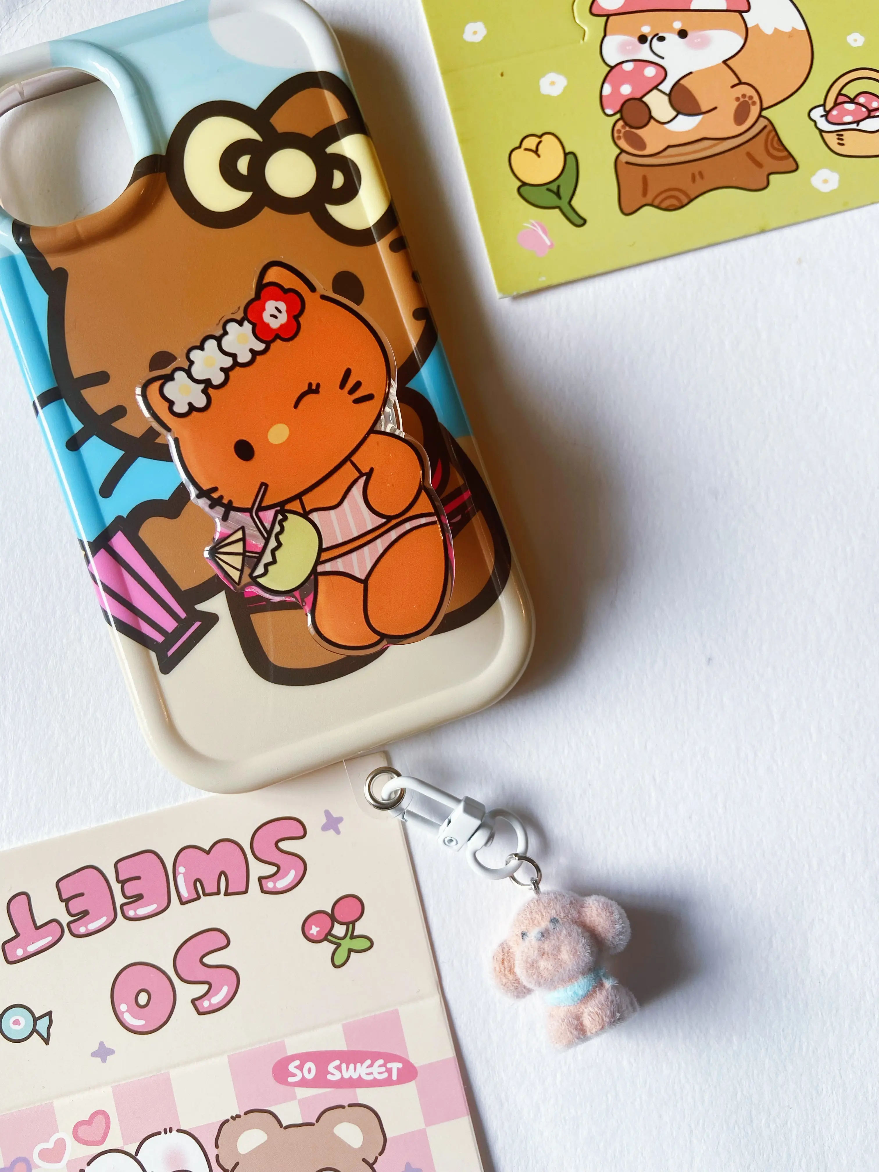 It’s so cute!!!! It came with a plastic to attach it to the bottom of my phone, a string for the side, and a hook to attach it to my bag!😻 It also came with a cute little extra charm😆