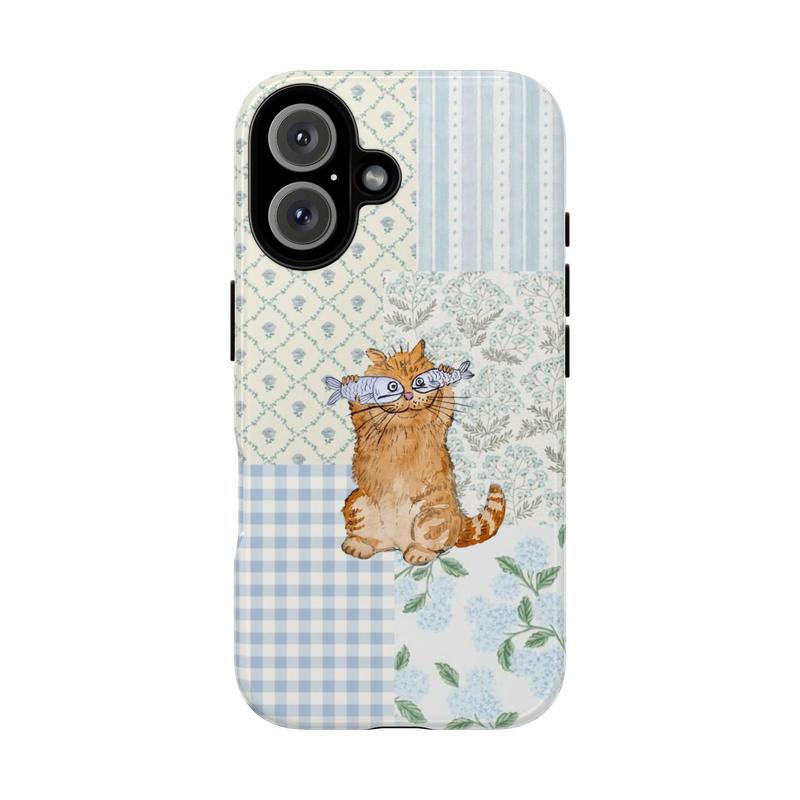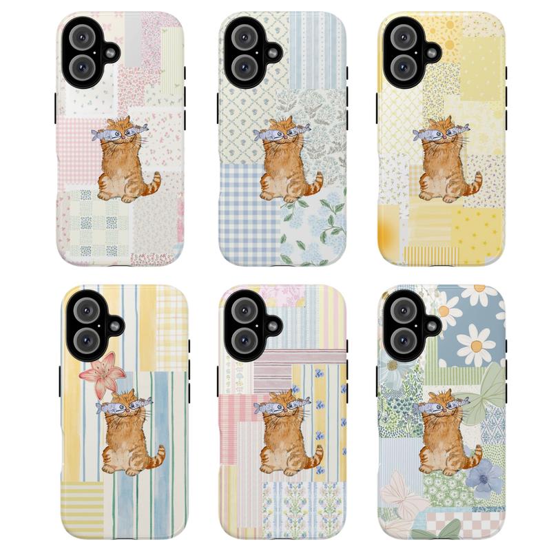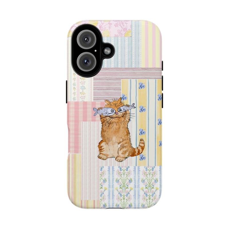 Cute Orange Cat Phone Case with Fish – collage Pastel Pattern Protective Cover, Gift for her, Gift for him, many background, Cartoon Phonecover, Ocean