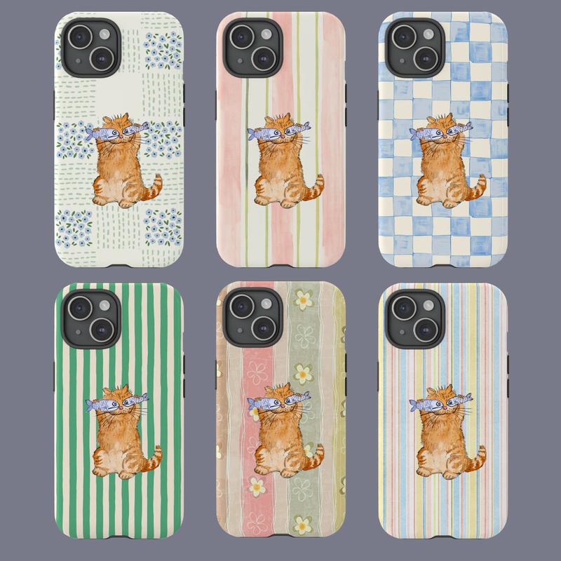 Cute Orange Cat Phone Case with Fish – Pastel Pattern Protective Cover, Gift for her, Gift for him, many background, Cartoon Phonecover, Ocean