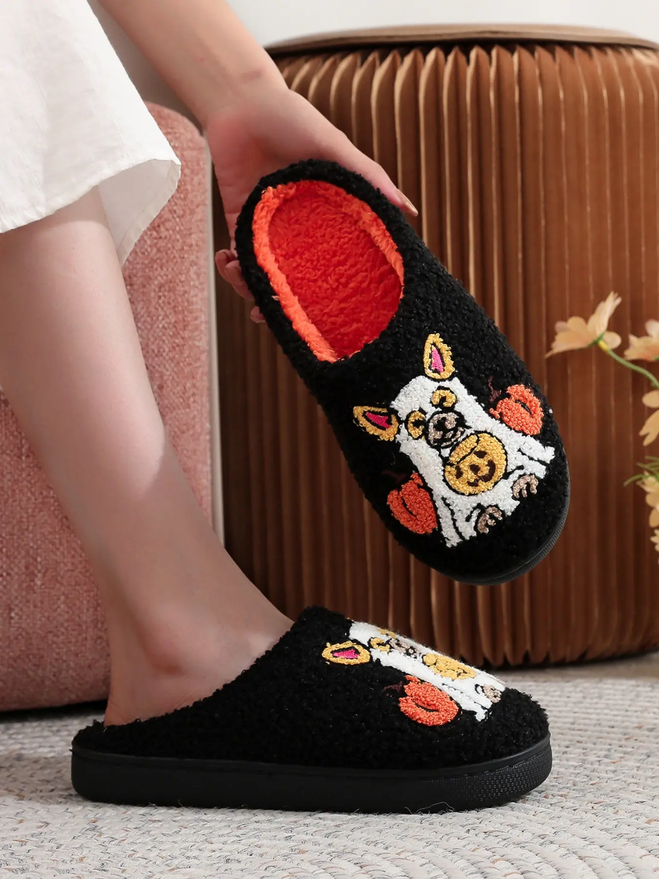 【Unique Embroidery】: Features an adorable pet dog and pumpkin embroidery that adds a charming touch to your indoor footwear.