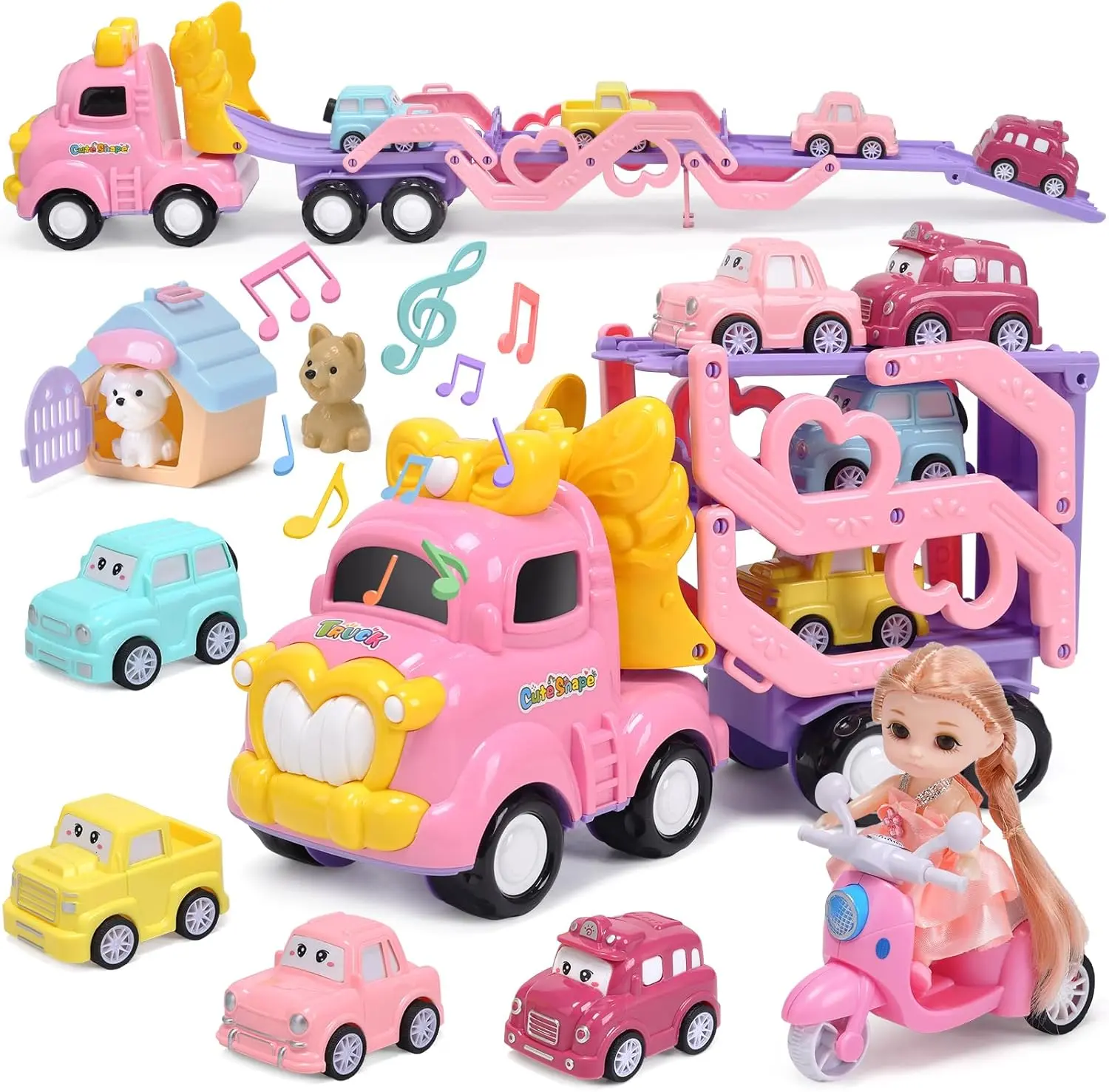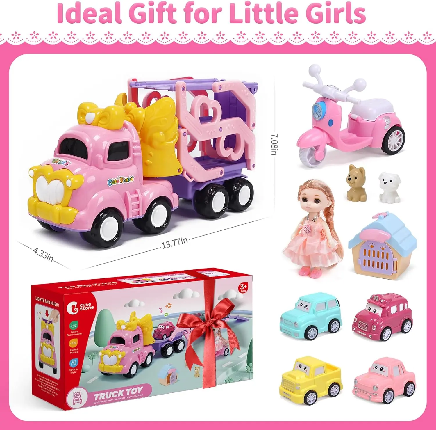 The Cute Stone princess truck set is a delightful 10-in-1 toy that captivates little girls. It includes a pink foldable transport truck, four colorful pull-back cars, a motorcycle with a doll, and two adorable pet dog friends with a pet house. This set offers various ways to play, inviting children on a magical princess exploration adventure. Perfect for imaginative play, it encourages creativity and storytelling.
