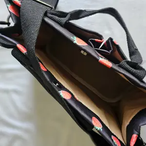 I am assuming my bag was defective. There was a middle piece that was charred on the edges broken off in the bag and there were a bunch of strings. Like the seams were not all the way sewn down. I was deeply disappointed cause it has a very cute print.
