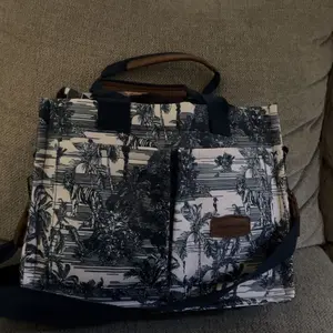 Capacity: 10/10 I can fit a lot in the bag!. Material: 10/10 I love the fabric and design pattern. Quality of work: 10/10 itâs a really sturdy bag, I donât feel like itâs gonna tear if I put too much in it. Characteristics: 8/10 I love that it has pockets on the outside and I love the space but I donât like the lack of compartments inside of the bag!.