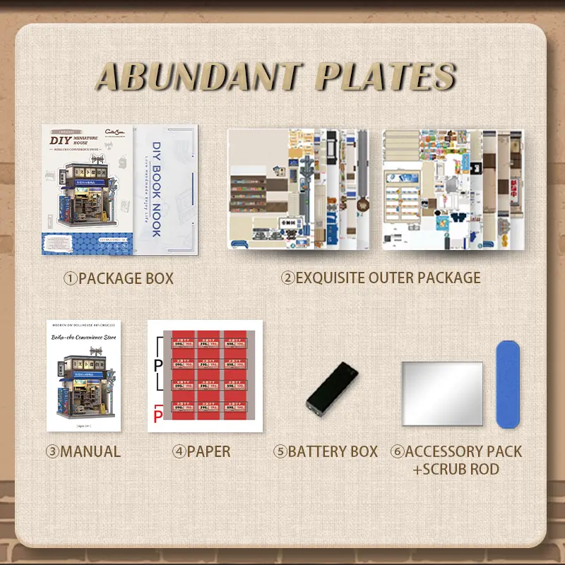 Notice - The DIY book nook kit has been 100% carefully checked before delivery to ensure that the accessories are complete and not missing. If you have any questions during assembly, please feel free to contact us. We will solve any problems as soon as possible. Note: You need to prepare silicone liquid glue and two batteries (type AAA).