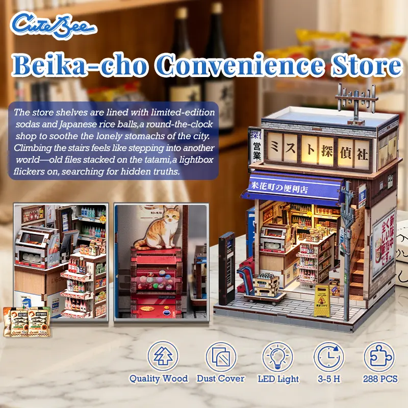 One side features a vibrant convenience store under a blue awning; the other, a shadowy staircase leading to a detective agency. A single build, two contrasting worlds—this exquisite book nook kit Japan style is perfect for adding a touch of narrative charm to your space.