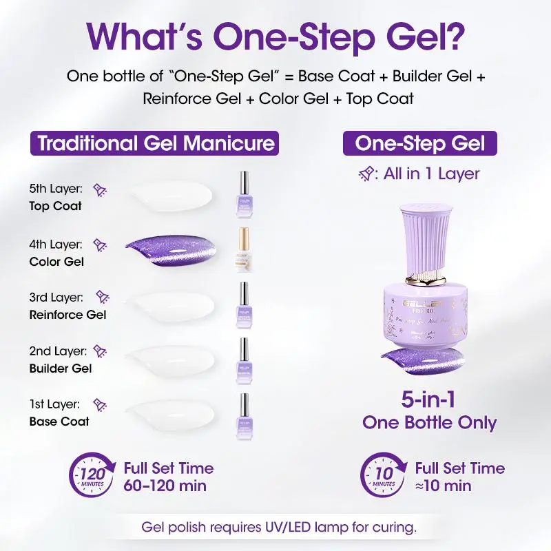 Compared with traditional gel polish, this One-Step Gel is much simpler and faster — no base coat or top coat needed.