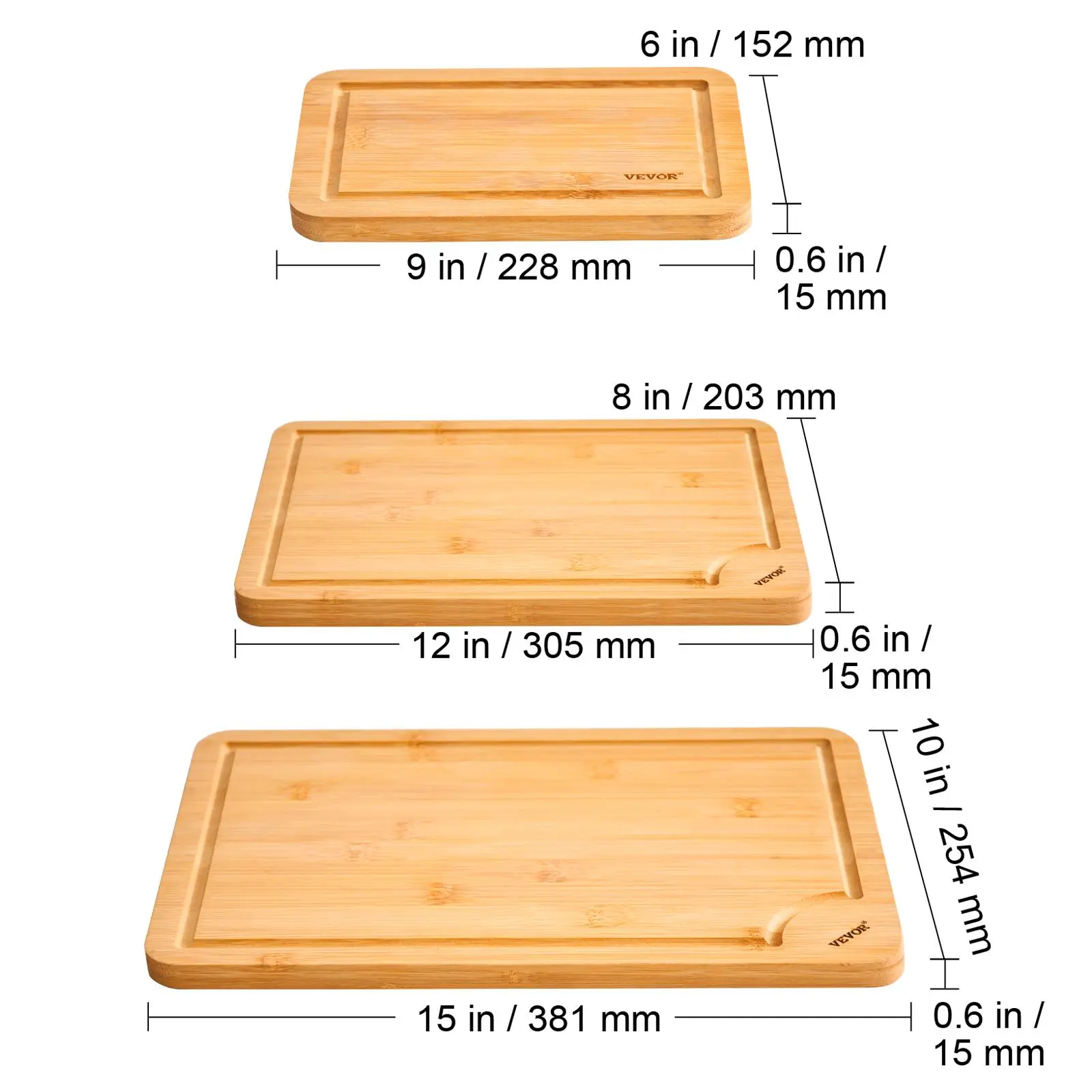 • Natural Bamboo Material: Made from sustainable bamboo, this cutting board set is durable. The 0.6 in / 15mm thickness ensures long-lasting use, maintaining its flatness and withstanding warping, making it a dependable choice for your kitchen.