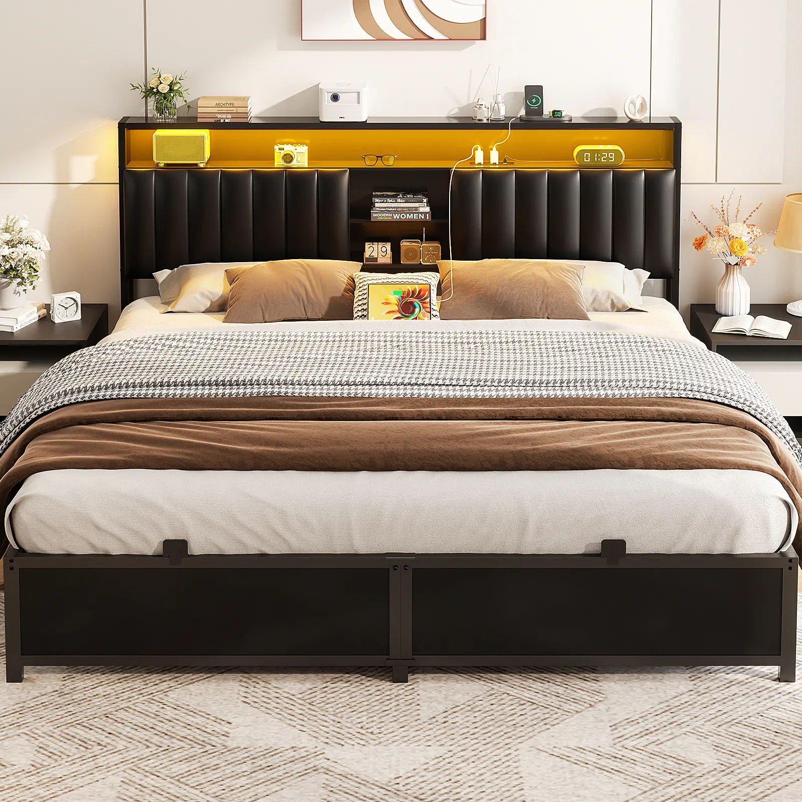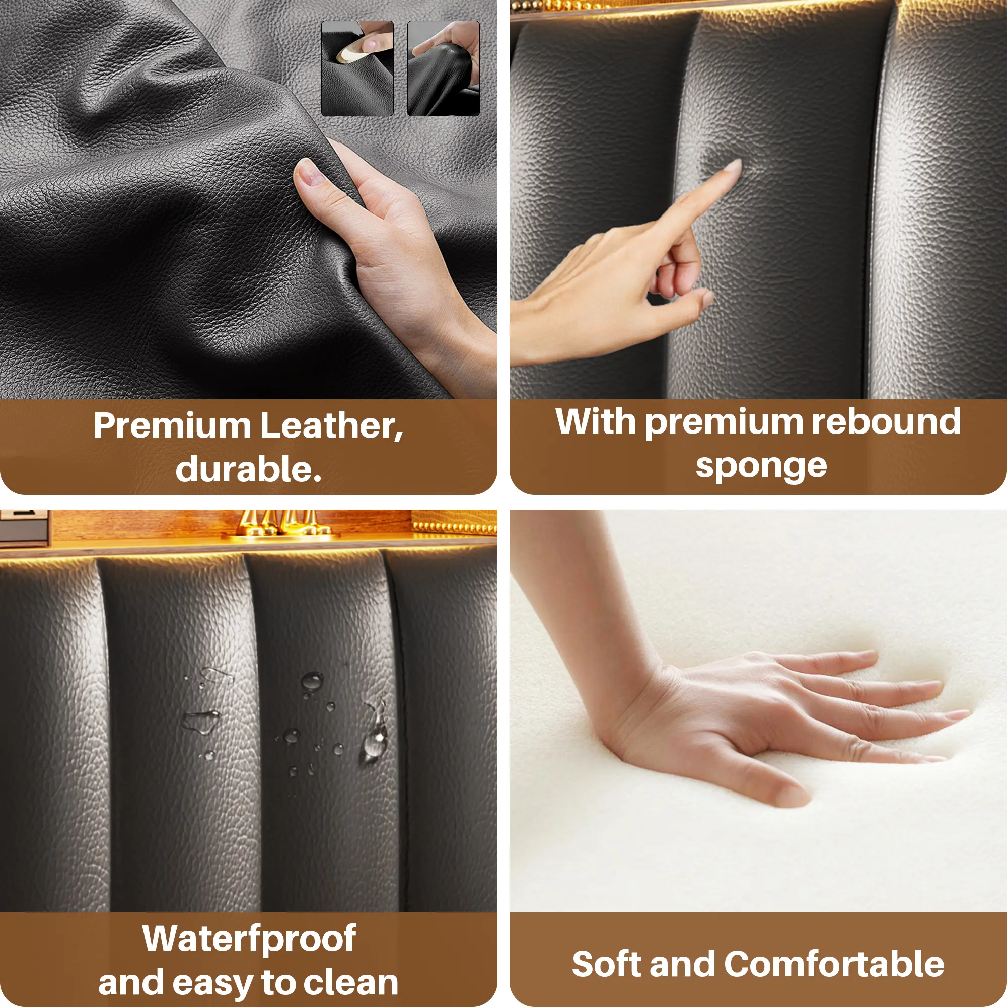 ·Material: Wood+ PU Leather Upholstered +Metal Frame + LED Lights +Power Outlet