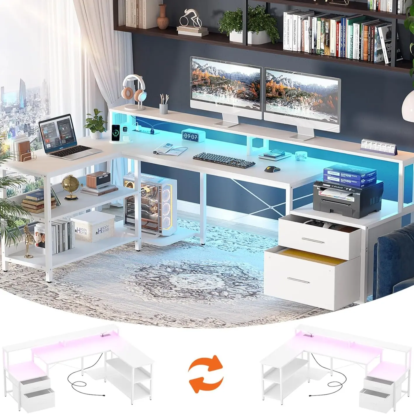 The L shaped gaming desk features built-in RGB LED light strip, control via smart APP, Over 60000 colors and multiple modes for your to choose. Led lights built-in music sync function can change the lights color with the rhythm of the sound and music, just enjoy it in a smart way, Light Up Your Gaming with LED Lights, and add immersive vibes.