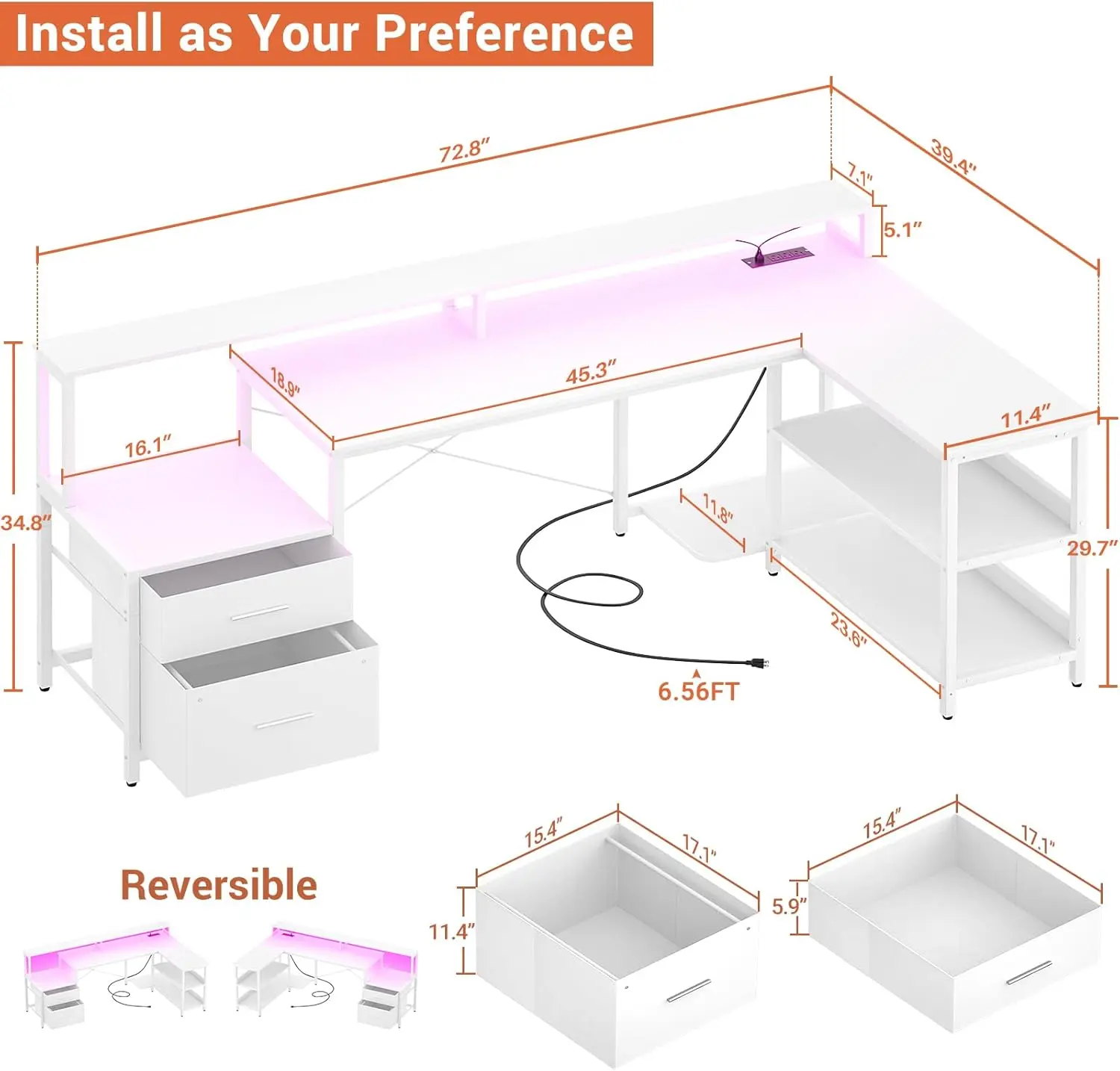 The L shaped desk with drawers is with reversible design to suit your space perfectly. Whether it's for home office working, gaming, or studying, enjoy the freedom to set it up as a left or right-corner desk, adapting to your specific needs. The 66 inch corner desk with a large main desktop could hold two desktop computers and one notebook computer. Dimension: 66.8"L x 39.4"W x 34.8"H