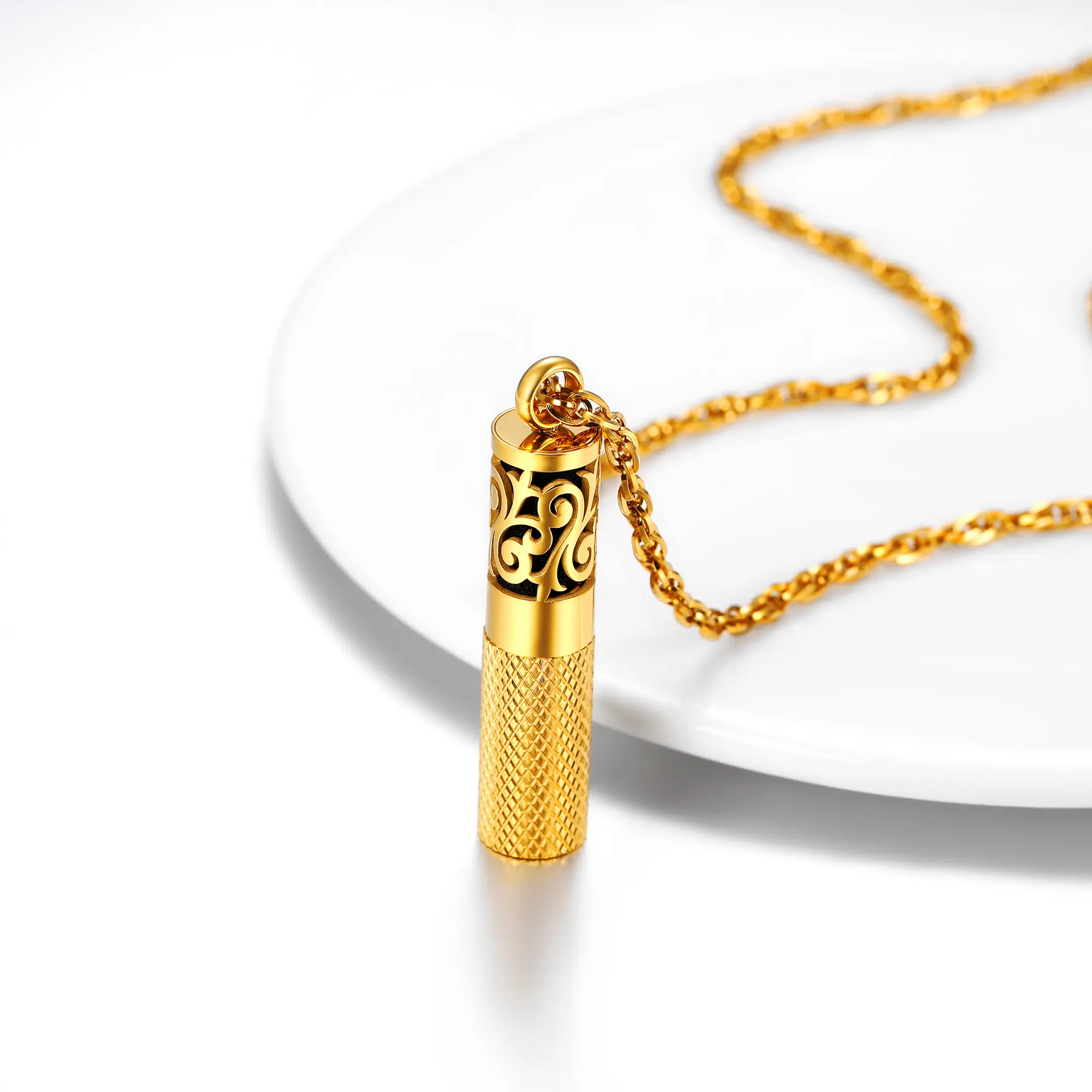 Discover the exquisite beauty of our Cylinder Locket Pendant featuring intersecting cloud patterns and a crosshatch base, designed to hold your favorite fragrance. This unique pendant combines elegant design with practical functionality, allowing you to carry your signature scent with you wherever you go.