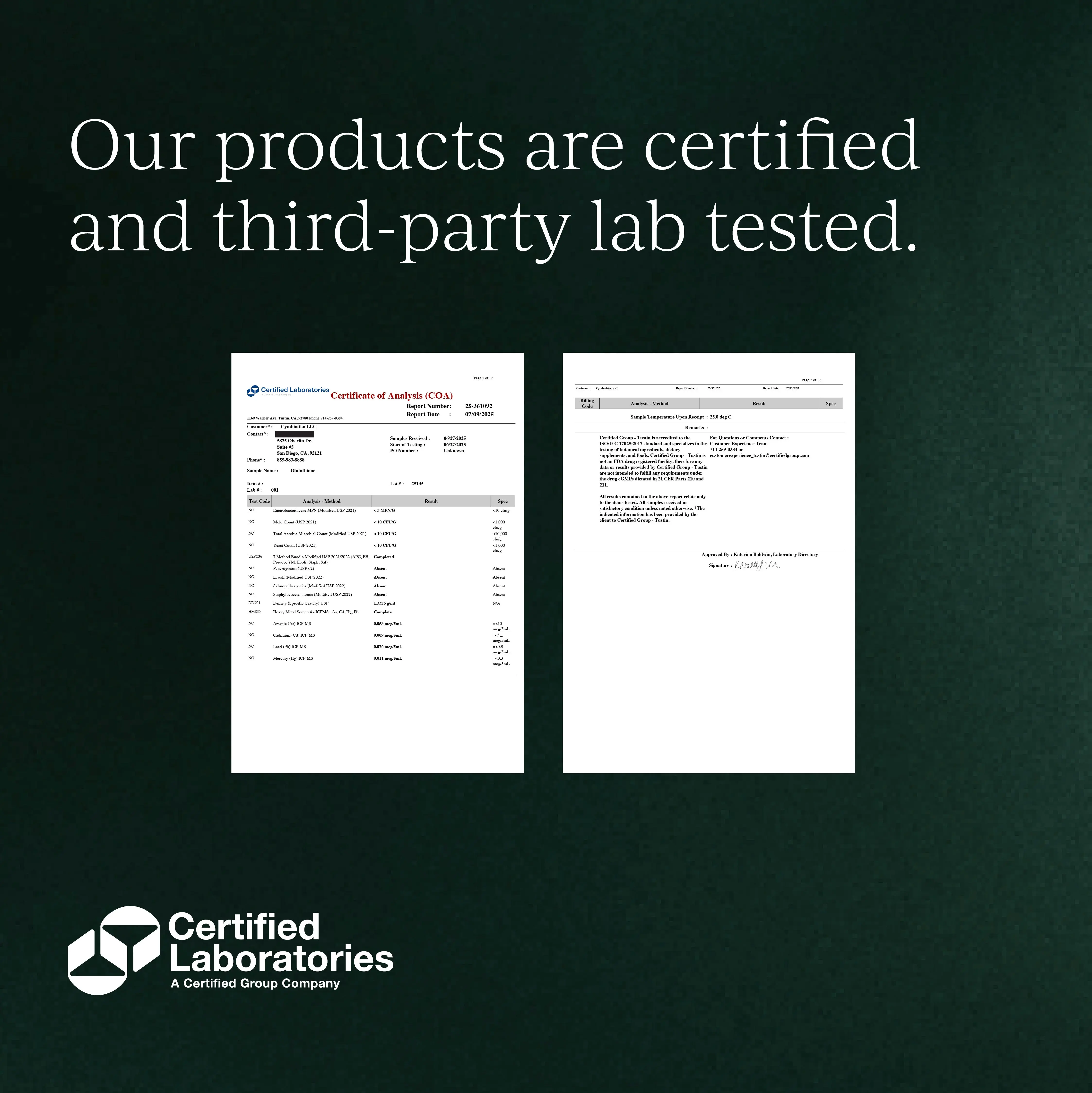 Tested for purity and safety by Certified Labs. Verified absence of harmful bacteria, heavy metals, and contaminants. Product meets all quality standards, with clear labeling and stability checks for your peace of mind.