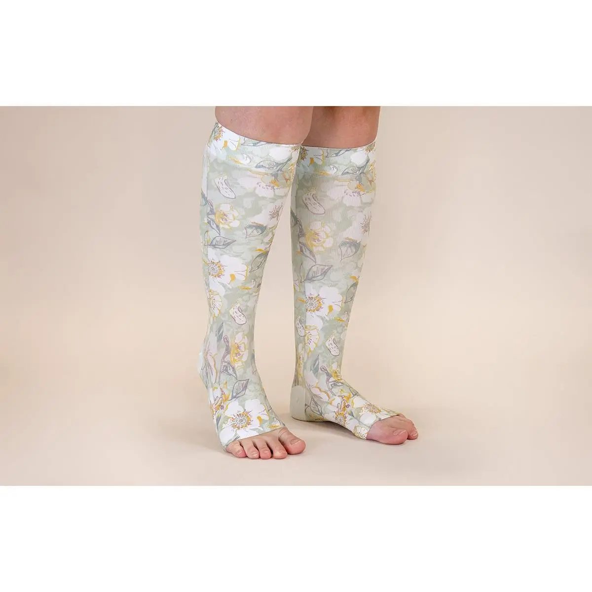 Cynthia Gradient Compression Socks combine therapeutic support with beautiful design. These USA-made socks feature a soft botanical print in sage green with white blossoms and golden accents. Engineered with high-tech microfiber and X-Static® silver technology, they provide moisture-wicking comfort and permanent antimicrobial protection. The floating heel design and extra-wide band ensure easy wear without irritation. Available in three compression levels (15-20, 20-30, and 30-40 mmHg), they effectively manage lymphedema, edema, and leg swelling while improving circulation and supporting recovery.