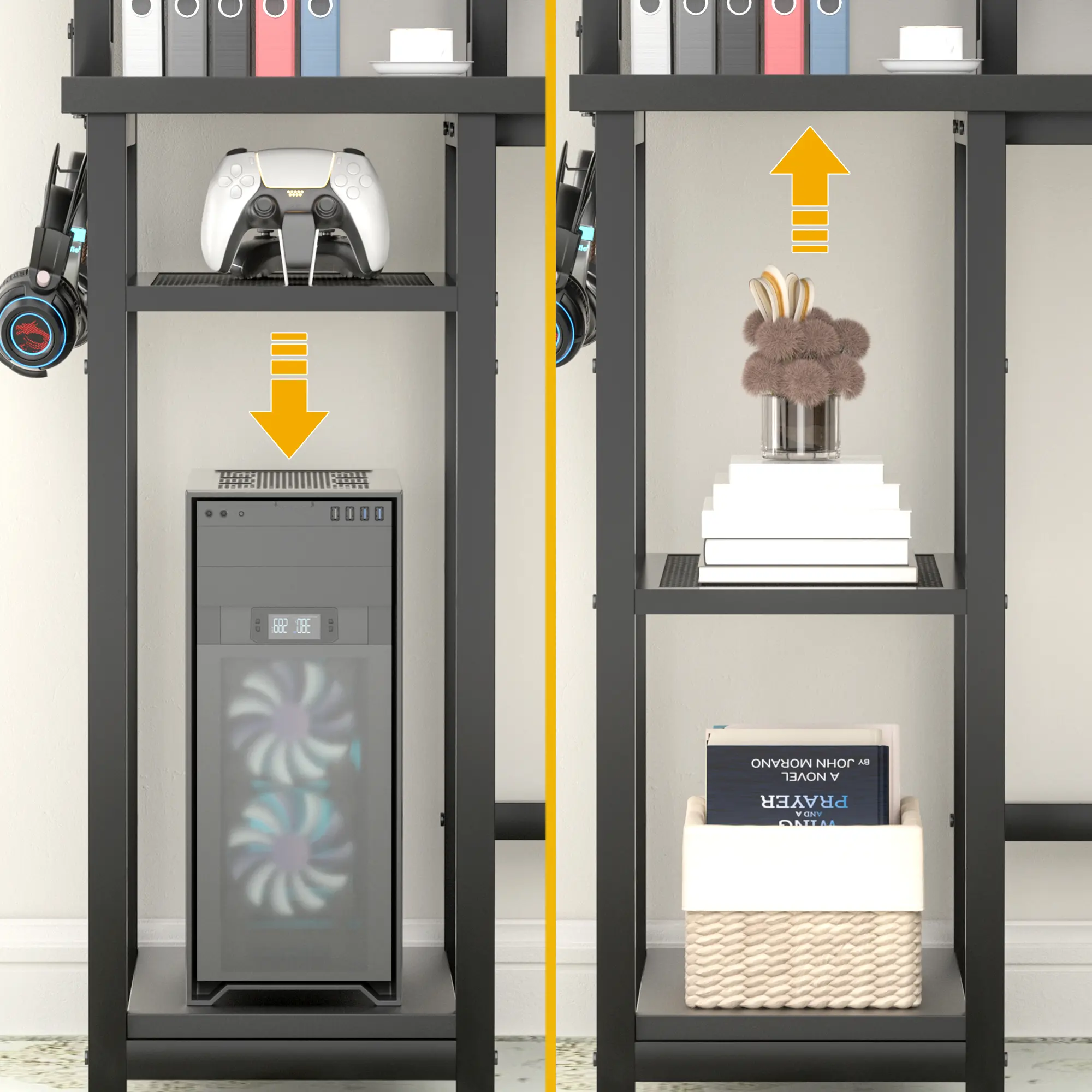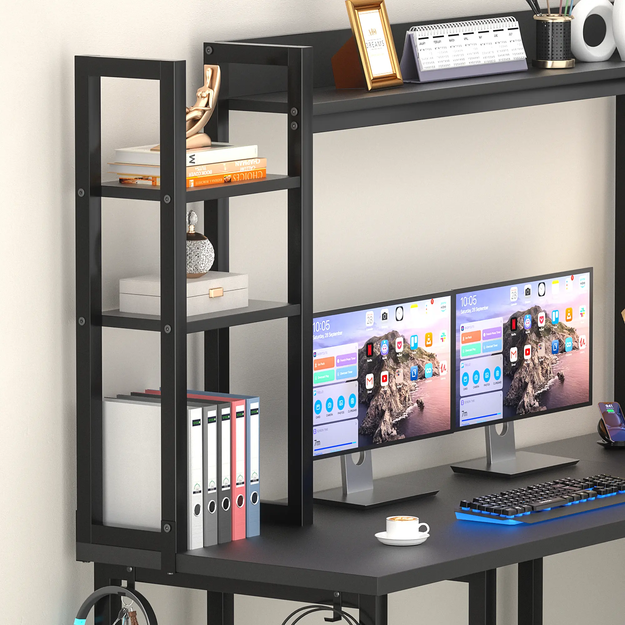 This home office desk includes 2 spacious desktops which can fully accommodate 2 desktop computers and 1 notebook computer. The top full storage hutch provide enough space for storing files, books, plants, gaming gears, office essentials, Side Shelves easily place your favorite decorations. An ideal desk for small rooms to maximize your life space.