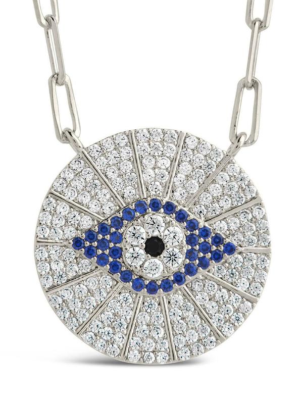 Shine bright and bold with this striking and unique evil eye pendant! This dainty disk is adorned with sparkling CZ stones. Available in gold and silver tones.