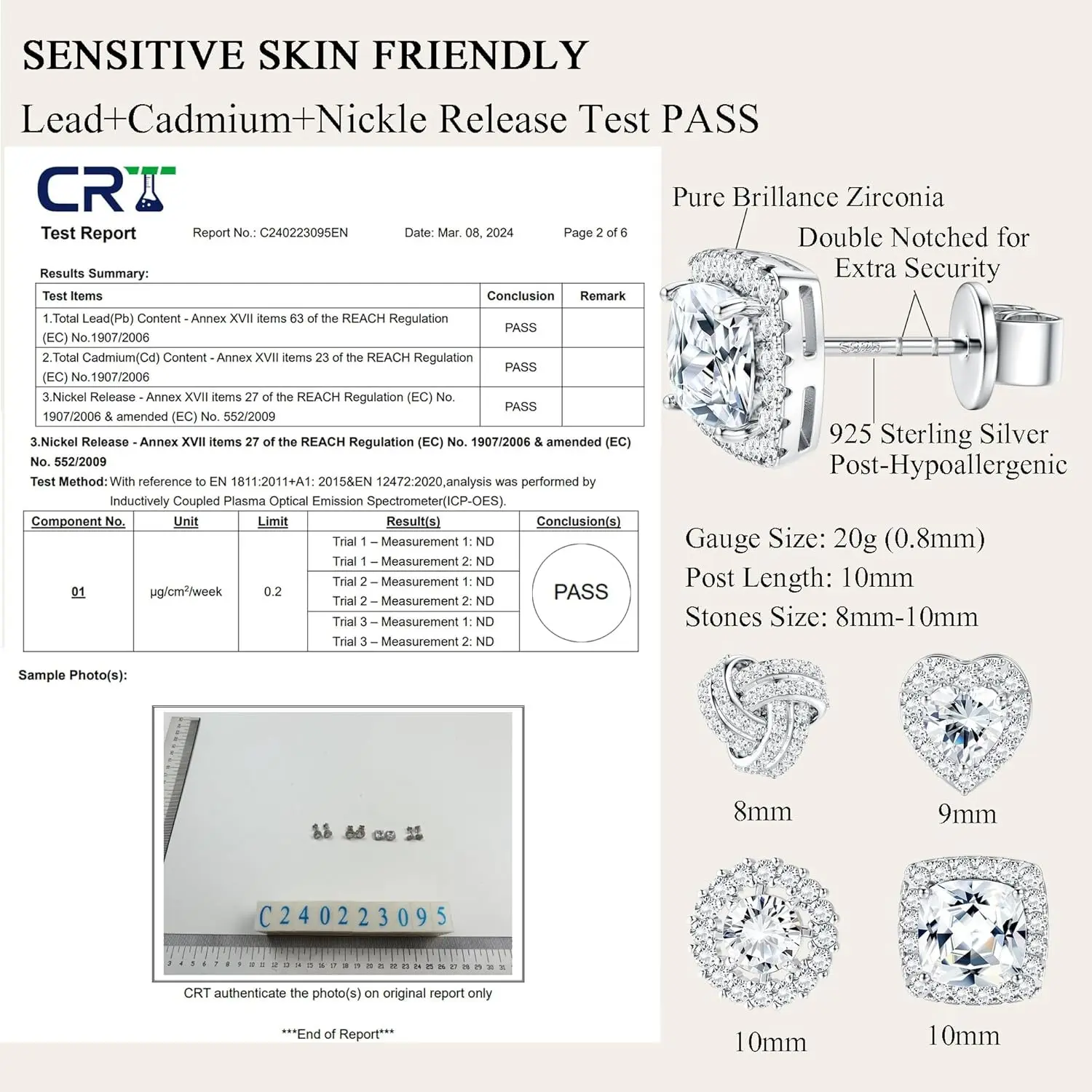 Our stud earrings are designed with a 20g (0.8mm) gauge and an extra-long 10mm post, ideal for various earlobe thicknesses.
